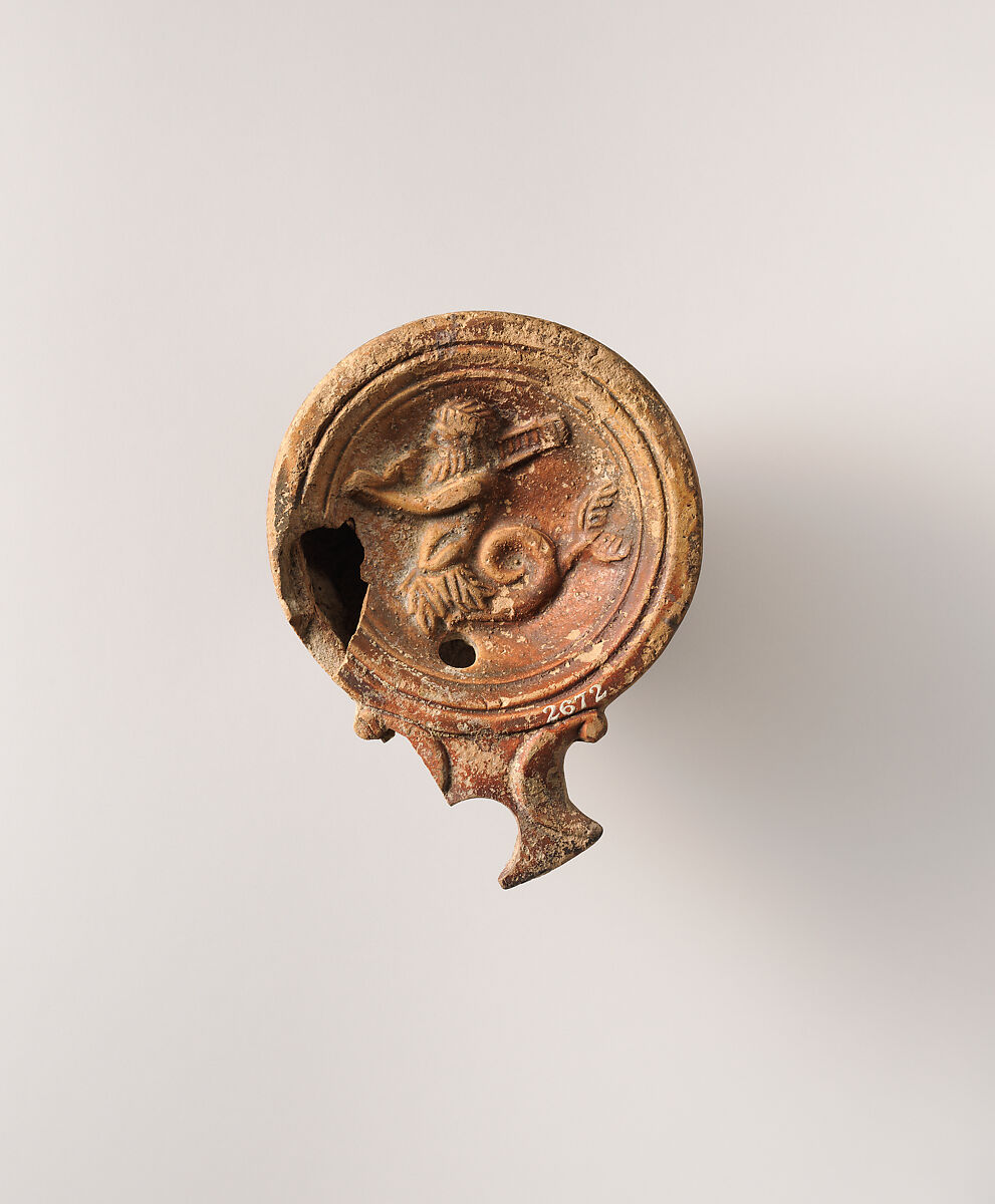 Loeschcke Type 1A. Mold-made. Discus: bearded Triton, facing left, naked to waist, and a curled fish tail issuing from a leafy skirt, and holding over his proper right shoulder a rudder (?); a single filling hole at bottom left; band of a single broad line flanked by two concentric grooves towards edge. Volutes flanking angular nozzle. Broad, raised base ring, and flat base.