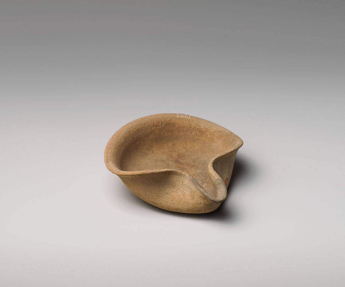 Wheel-made with edge folded in to form a wick rest; flaring rim, with rounded lip; broad, open body, sloping forward; undefined, convex base, slanting slightly to right.
