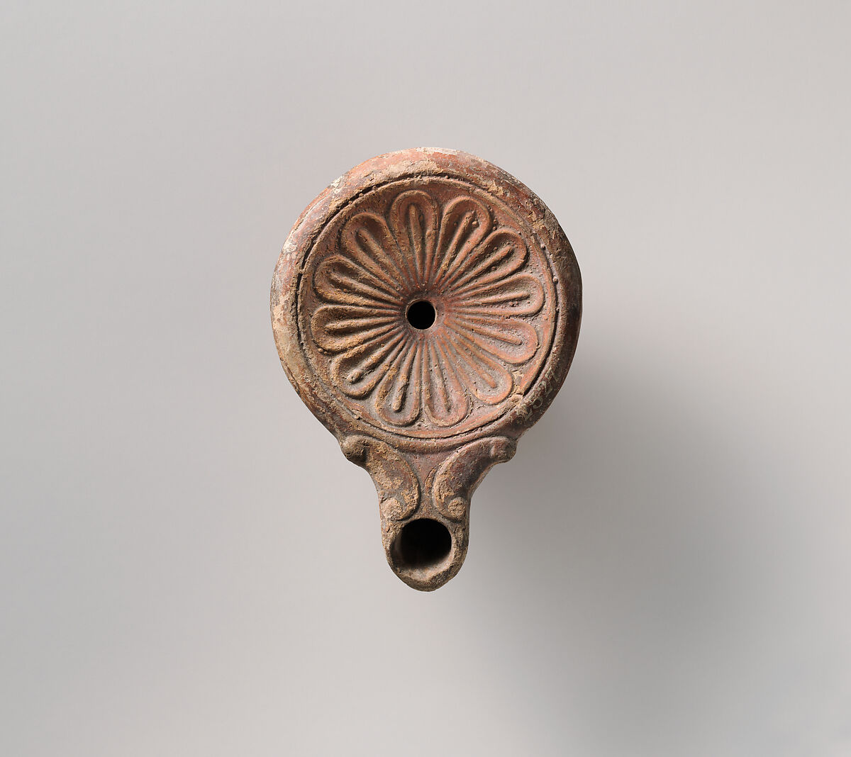 Loeschcke Type 4. Mold-made. Discus: rosette of twelve rounded petals with central rib; a single small filling hole at center; single groove around edge; undecorated, narrow, sloping shoulder. Volutes flanking nozzle, with large wick hole. Incised base ring, and uneven, slightly concave base.