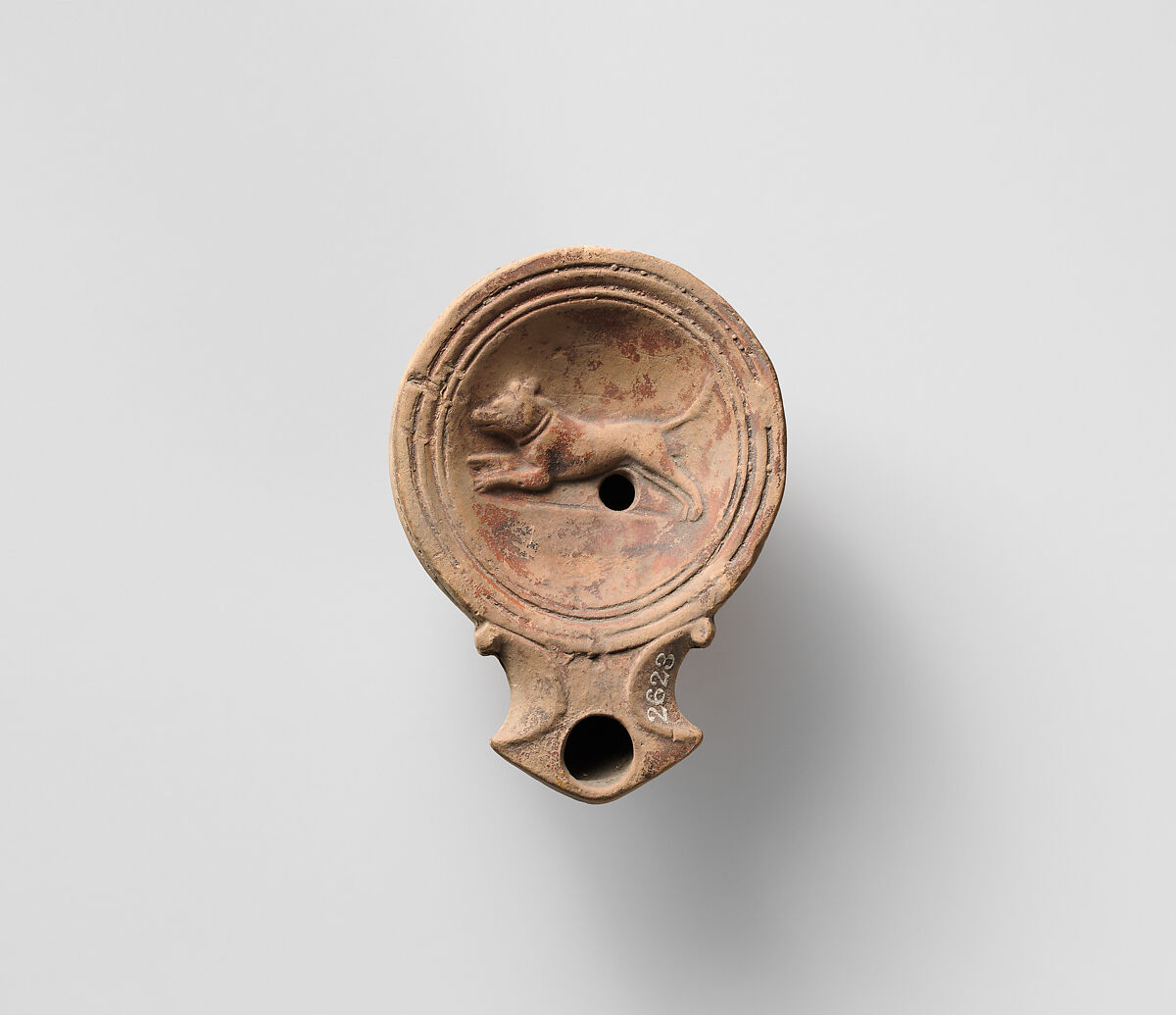Loeschcke Type 1A. Mold-made. Discus: large dog springing to left, with erect tai and collar round neck; ground line below; a single filling hole below dog's body, with a band of lines and grooves at edge. Volutes flanking angular nozzle. Raised base ring, and slightly concave base.