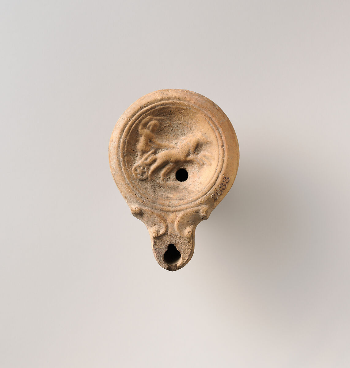 Loeschcke Type 4. Mold-made. Discus: charioteer driving biga to right, holding reins in left hand and whip in right over his head; a single filling hole at right below horses' bodies; band of lines and grooves towards edge; narrow, undecorated shoulder. Volutes flanking large nozzle. Incised base ring, and flat base.