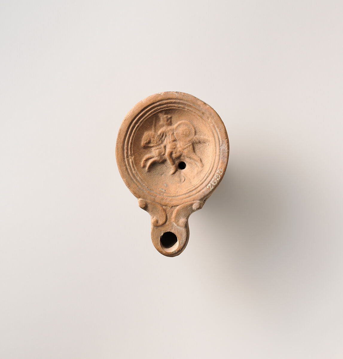 Loeschcke Type 4. Mold-made. Discus: cavalryman, with helmet, sword (or short spear?) and round shield, looking back over shoulder to right, while his horse gallops to left; a single, small filling hole at lower right; band of lines and grooves towards edge; narrow, plain shoulder. Volutes flanking nozzle; large wick hole. Incised base ring, and uneven, concave base; a small, central impressed, vertical maker's mark.