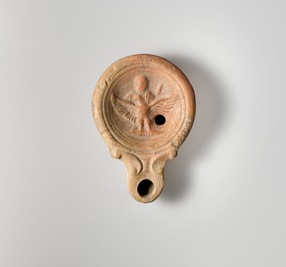 Loeschcke Type 4. Mold-made. Discus: Jupiter with scepter, facing forward, on back of eagle with outspread wings standing on a thunderbolt; a single filling hole at lower right; band of lines and grooves towards edge; narrow, plain shoulder. Volutes flanking nozzle; large wick hole. Incised base ring, and uneven, concave base.