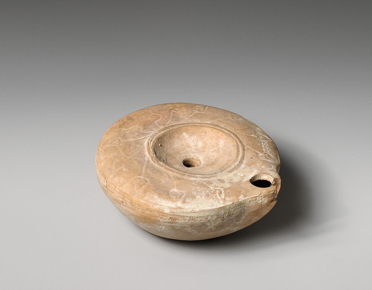 Mold-made. Large, deep body. Plain concave discus, with a single central filling hole, and a band of two lines and a groove around edge; broad, horizontal shoulder: impressed wreath of widely-spaced leaves; short, round, nozzle. Incised base ring, and concave base.