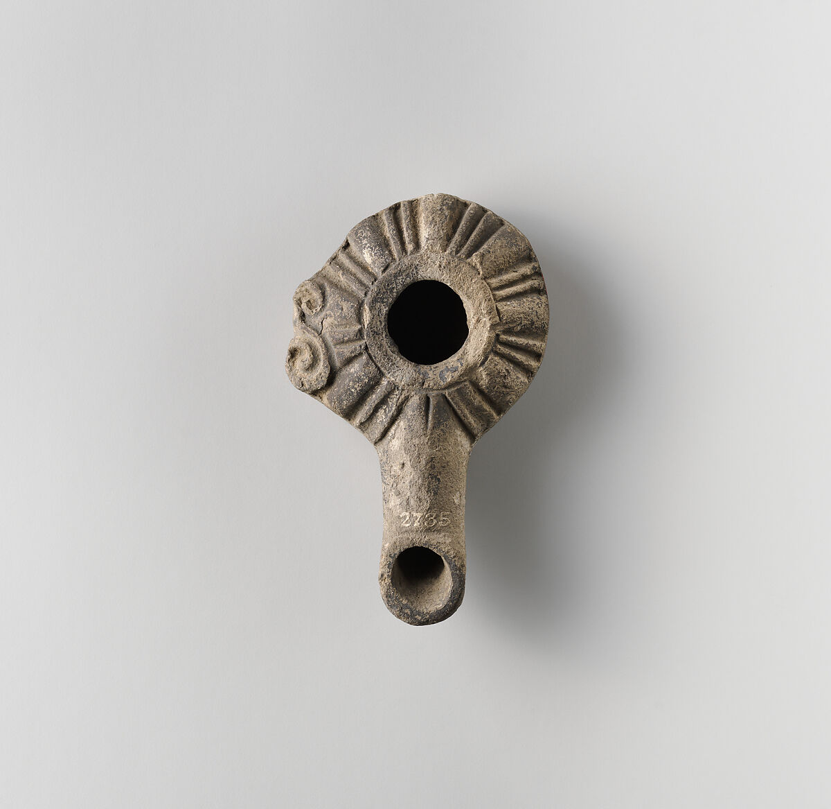 Mold-made. Small, shallow, carinated body. Central filling hole surrounded by a broad, horizontal band. Sloping shoulder, decorated with radiating bands of grooves and lines; at left, large S-shaped knob. Long, straight, tubular nozzle, with circular rim to wick hole. Incised base ring, and slightly concave base.
