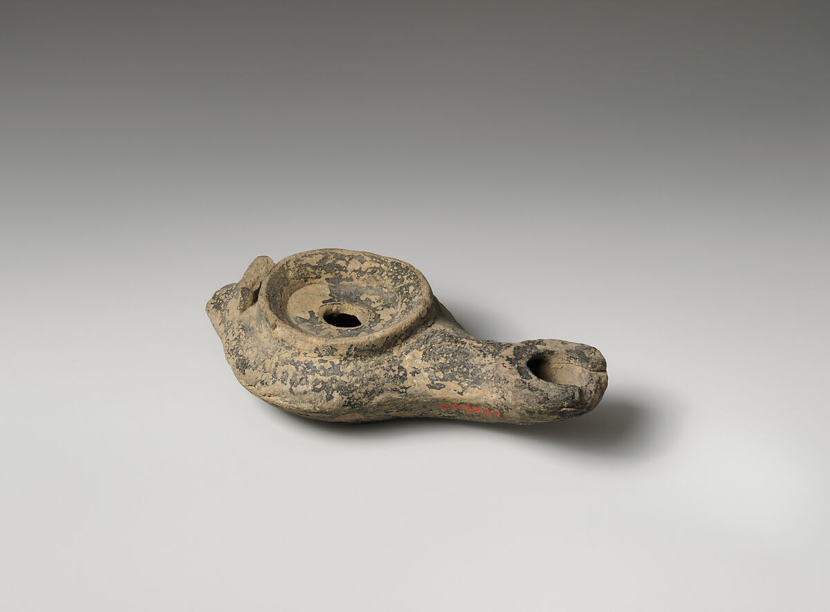 Mold-made. Carinated body, with applied loop handle. Central filling hole within flat, plain discus, surrounded by a broad, flaring edge. Rounded, plain, narrow shoulder. Large nozzle, with circular, horizontal rim to large wick hole. Base ring, and flat base.