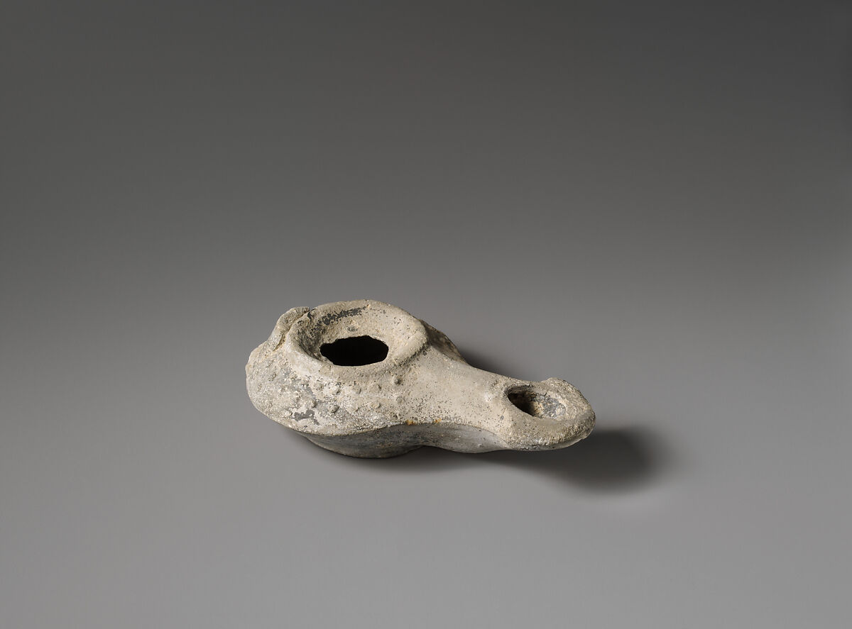 Mold-made. Carinated body, with applied loop handle. Central filling hole within deep, concave discus, surrounded by a broad, raised edge. Sloping shoulder, decorated in relief with dots. Angular sides to nozzle, rounded at front. Raised base ring, and flat base.