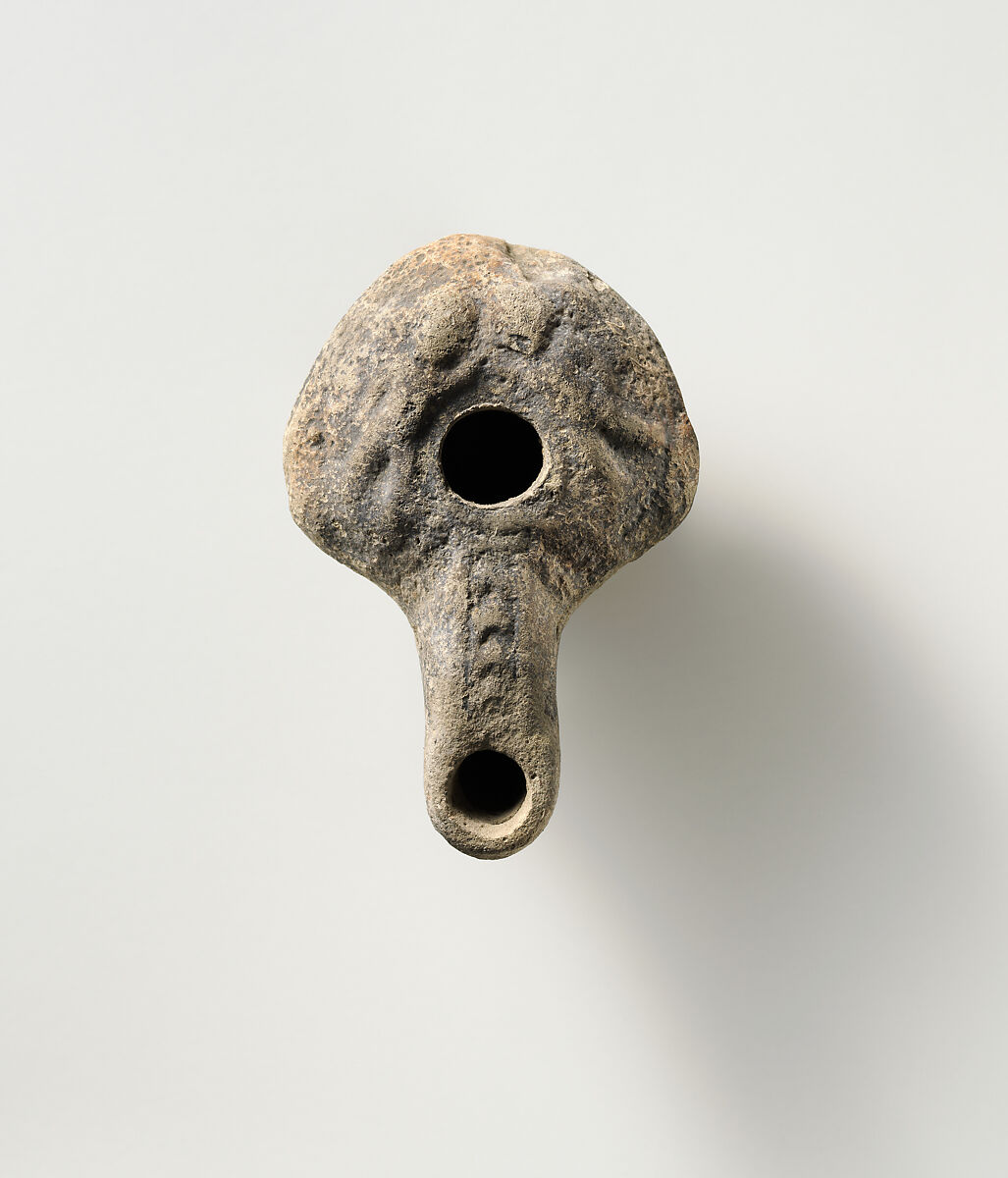 Mold-made. Almost triangular body. Irregular, central filling hole. Sloping shoulder, decorated in relief with two standing figures (Erotes?) with legs to front and heads almost touching at back; at sides, projecting knobs, and on top of nozzle, chevron (?) pattern. Long, straight nozzle. Undefined base ring, and uneven base.
