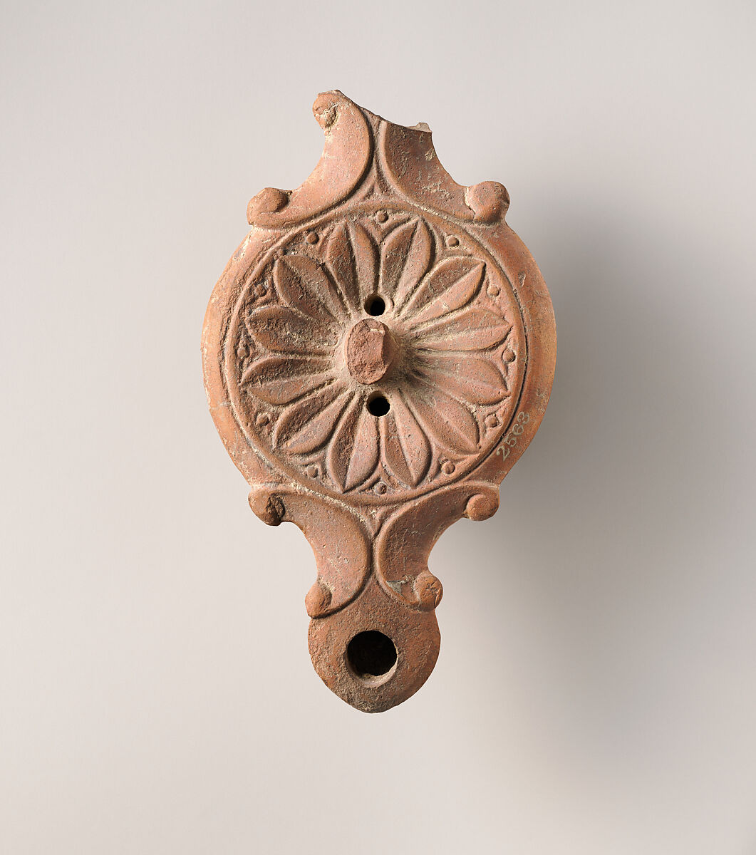 Mold-made. Large discus: rosette with twelve petals, interspersed with stylized buds, radiating from a central handle or suspension knob, flanked by two filling holes facing each of the nozzles. Narrow, sloping shoulder. Large volutes flanking nozzles, with large wick holes. Double base ring, and flat base with central circle as maker's mark.