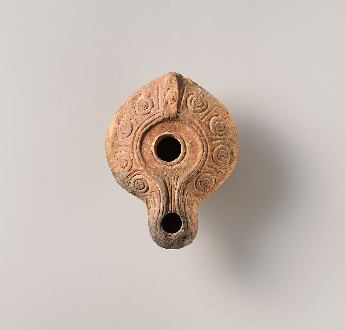 Broneer Type 29, Group 3. Mold-made. Unpierced handle. Flat, plain discus: a large central filling hole with raised lip; plant motif in nozzle channel. Shoulder: targets within panels, and long tongues on each side of nozzle. Broad base ring, flanked by incised circles, and small uneven base filled with maker's stamp, comprising a rosette of four petal. On underside of body: at front; a band of three incised lines to either side of nozzle; at back, two long curving lappets issuing from base of handle.