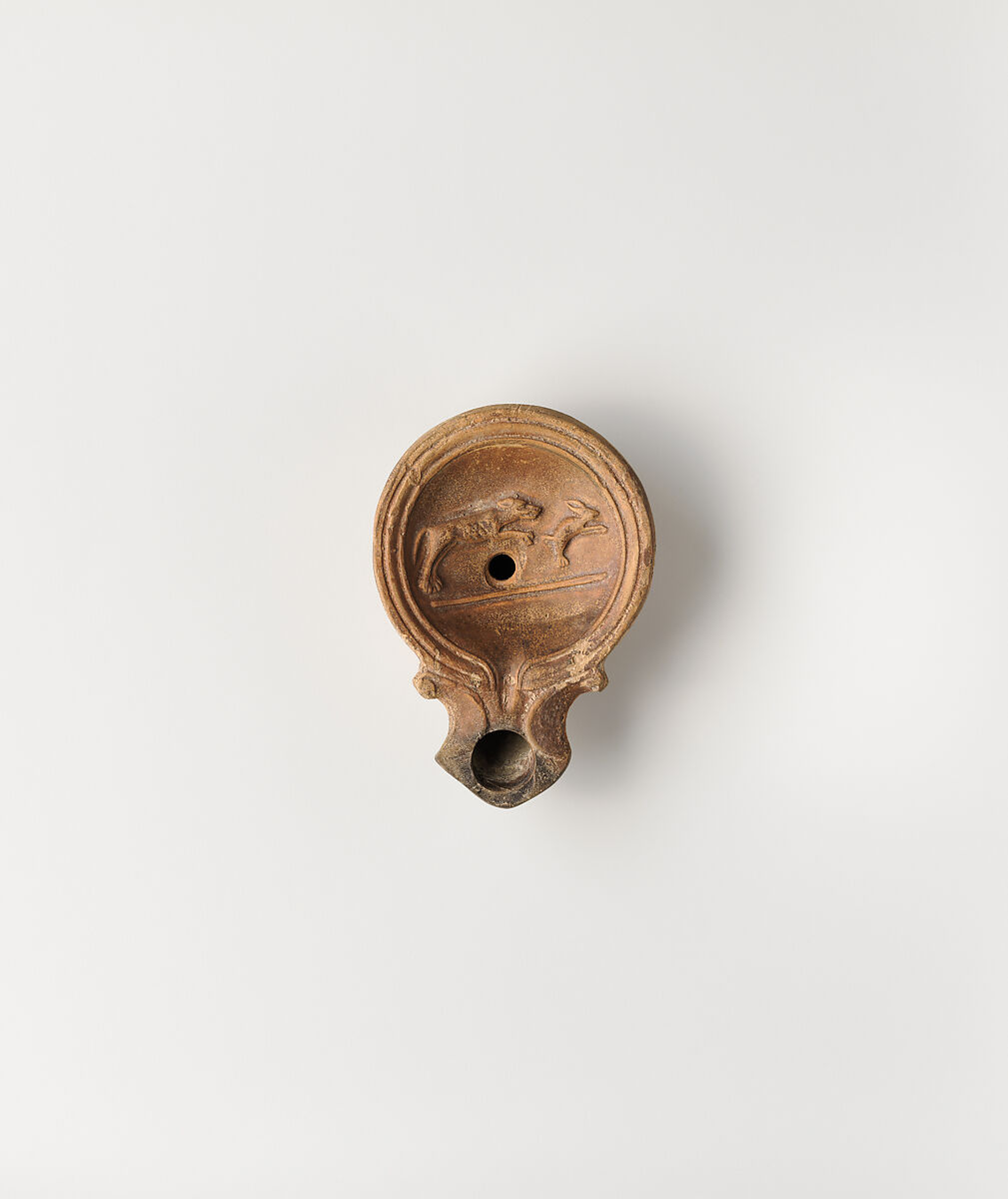 Loeschcke Type 1A, with nozzle channel. Mold-made. Discus: in high relief, a hound chasing a hare, both running from left above ground line slanting up to right; a single filling hole at center above line; band of lines and grooves around edge. Volutes flanking angular nozzle, with large wick hole. Raised base ring, flanked by two incised circles, and a deep concave base.