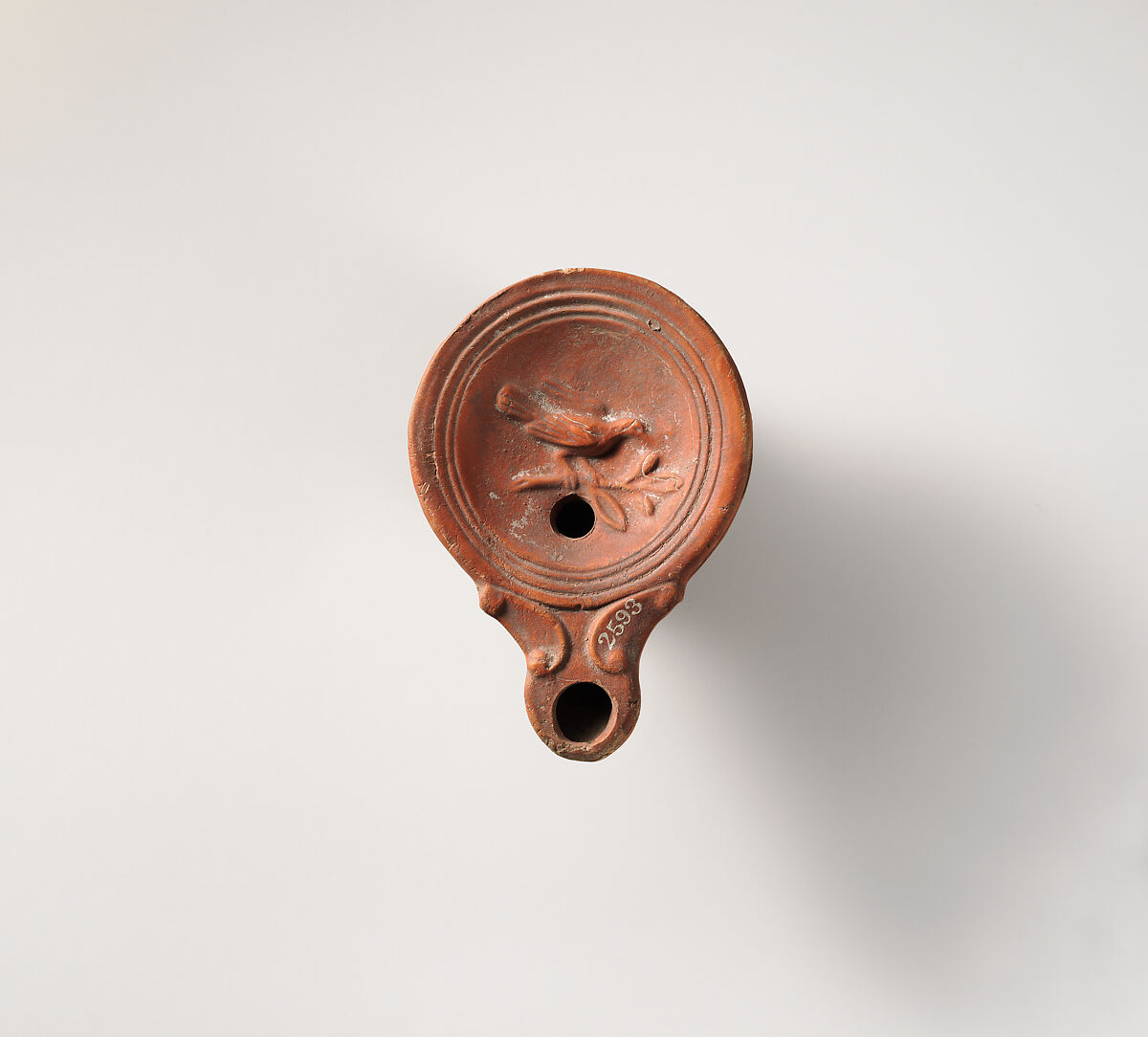 Loeschcke Type 4. Mold-made. Discus: bird facing right and perched on a bough; a single filling hole below; band of lines and grooves towards edge. Volutes flanking nozzle, with large wick hole. Incised base ring, and uneven, pushed-in base.
