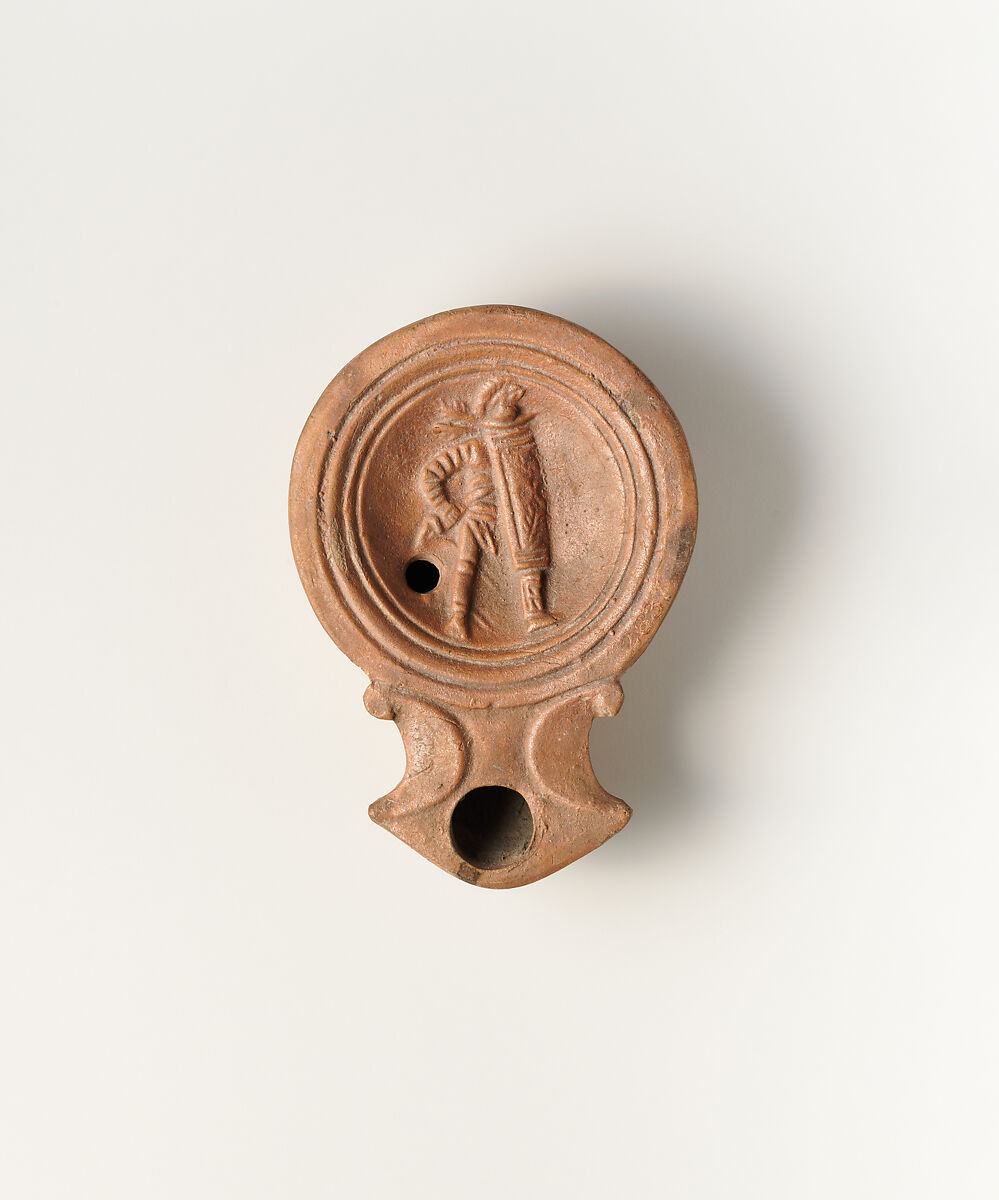 Loeschcke Type 1A. Mold-made. Discus: heavily armored gladiator, standing facing right, wearing a helmet with plumes behind, armor on his right arm, greaves, and a large rectangular shield that protects his entire body, and holding in his right hand a short sword; a single filling hole at bottom left, and a band of lines and grooves towards edge. Volutes flanking wide, angular nozzle, with large wick hole. Incised base ring, and flat base.
