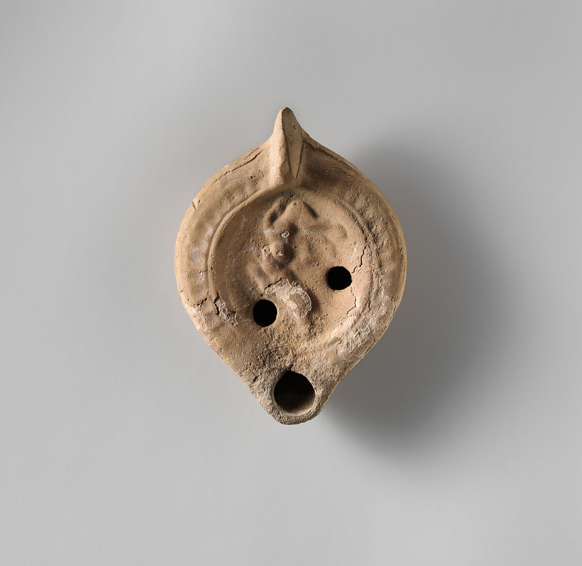 Loeschcke Type 8. Mold-made, with unpierced handle. Discus: a scene, comprising two ill-defined figures, possibly to be viewed from the right; a standing man leans forward with head bent, facing left, and an animal leaps forward from the left with its front legs above the man's head; two filling holes above and below the animal. Shoulder: narrow pattern of indistinct ovules. Undefined, broad, flat base, with inscription: EΔIN (?). Raised bar running from base to back of handle.