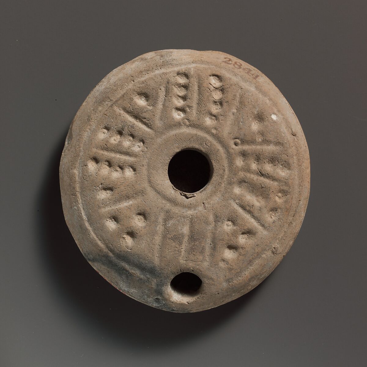 Vessberg Type 20. Mold-made. Shallow, lentoid shape, with impressed decoration. Large, oval central filling hole, surrounded by a broad band containing a star pattern between two circular grooves; the star pattern comprising four linear radiating spokes, each consisting of two rows of small impressed circles flanking a central groove and, between the spokes, four triangles (the two at back, containing a single impressed circle, and the two at front, three impressed circles; the outer circular groove broken by the wick hole. On the uneven base, a disk pattern, poorly executed, comprising a central dot with a circular groove, surrounded by a row of impressed dots and another circular groove, with a linear spoke at front, and traces of dots at back.