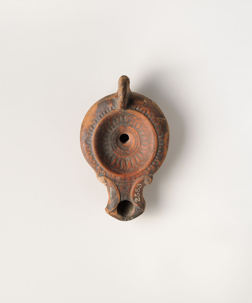Loeschcke Type 1A. Mold-made, with ring handle. Discus; a pattern of radiating lines outside a central band of three raised concentric circles, and a raised outer edge; single filling hole at center. On curving shoulder, a pattern of close-set ovules. Volutes flanking broad, angular nozzle, with large wick hole. Broad raised ring base, and a slightly uneven base, with an obscure impressed mark (planta pedis?) at center.