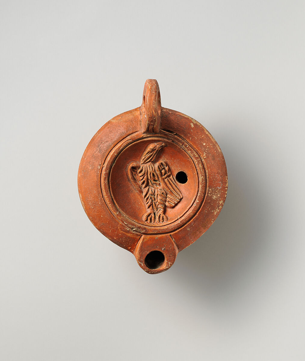 Loeschcke Type 8. Mold-made, with ring handle. Discus: in high relief, an eagle standing facing with wings at sides and head turned upward to right; a single filling hole towards right edge, and two grooves flanking a raised band at edge of discus; a broad, sloping, and undecorated shoulder. Two incised lines on front edge of handle. An incised base ring, and a shallow concave base.