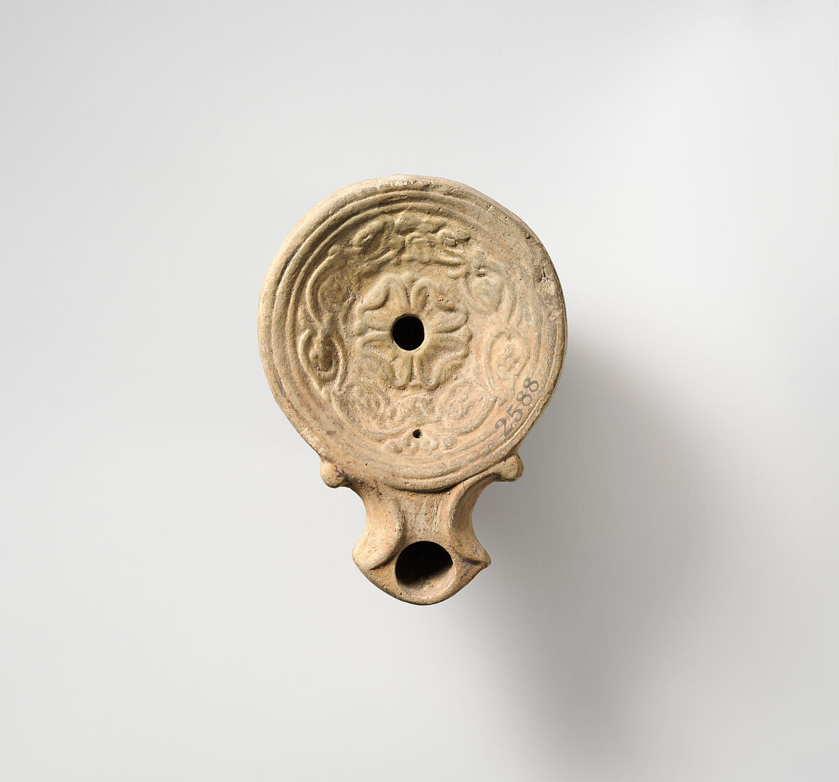 Loeschcke Type 1A. Mold-made. Discus: a central rosette with four large petals, surrounded by a frieze of tendrils with buds and flowers; a single filling hole at center, with a band of lines and grooves at edge. Volutes flanking angular nozzle, with a large wick hole. Raised base ring, with a narrow raised circle within, and a flat base.