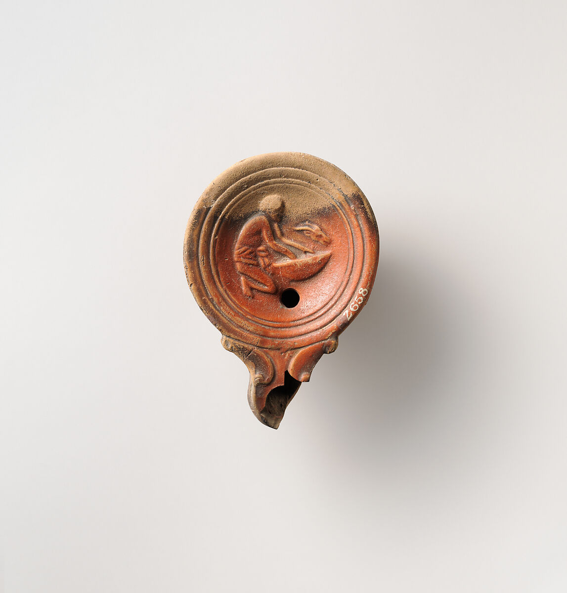 Loeschcke Type 4. Mold-made. Discus: at left, a slave, wearing a loin-cloth, kneeling to right with hands in a large basket or bowl; above to right, a goat's head; single filling hole below towards nozzle, with a band of lines and grooves towards edge. Volutes flanking nozzle. Incised base ring, and flat base.