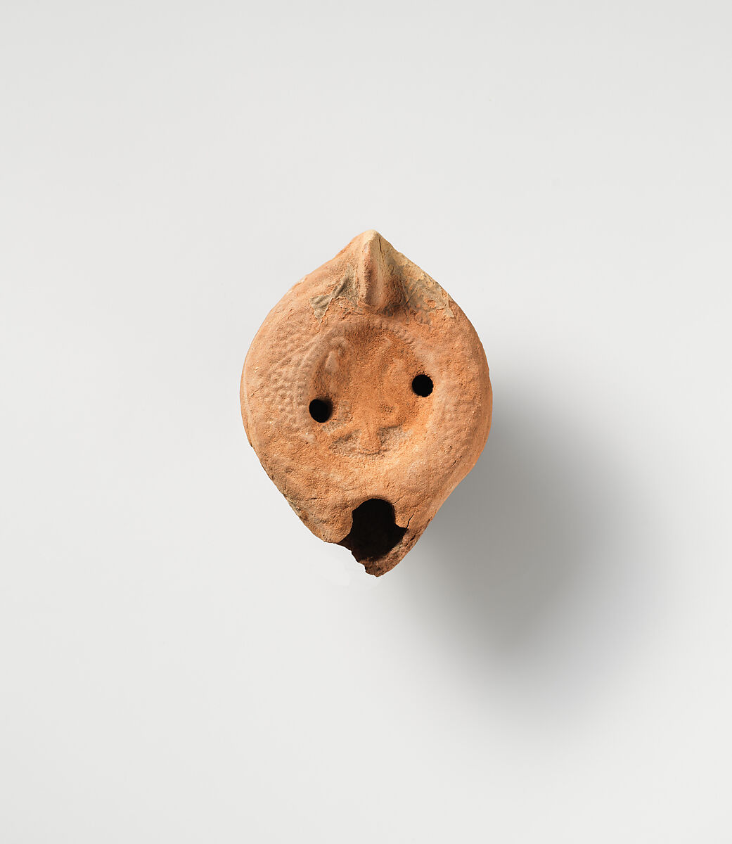 Broken with losses around wick hole and along left side of body; worn, weathered surface.