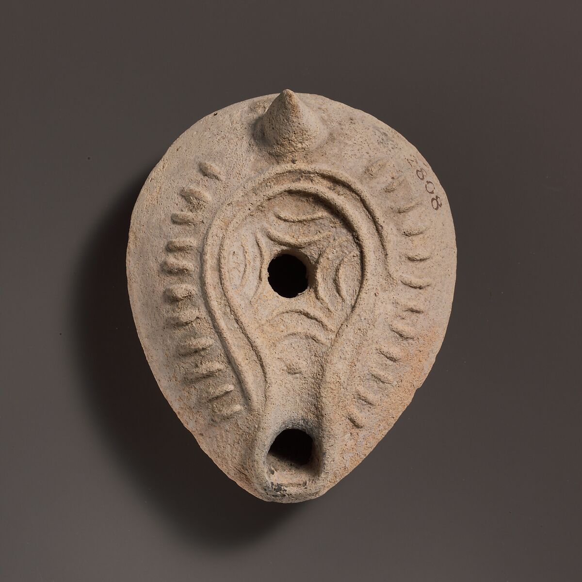Vessberg Type 19. Mold-made. Applied conical handle. Sharply carinated, pear-shaped body. Discus: square pattern comprising two curved, raised lines on each side around central filling hole; channel to wick hole, with a raised dot above; around discus, two raised, curving lines, the inner of which also encircles the wick hole. Wide, rounded shoulder with raised short lines on upper part. Small, flat base, with a pattern of a central hollow dot and a hollow circle.