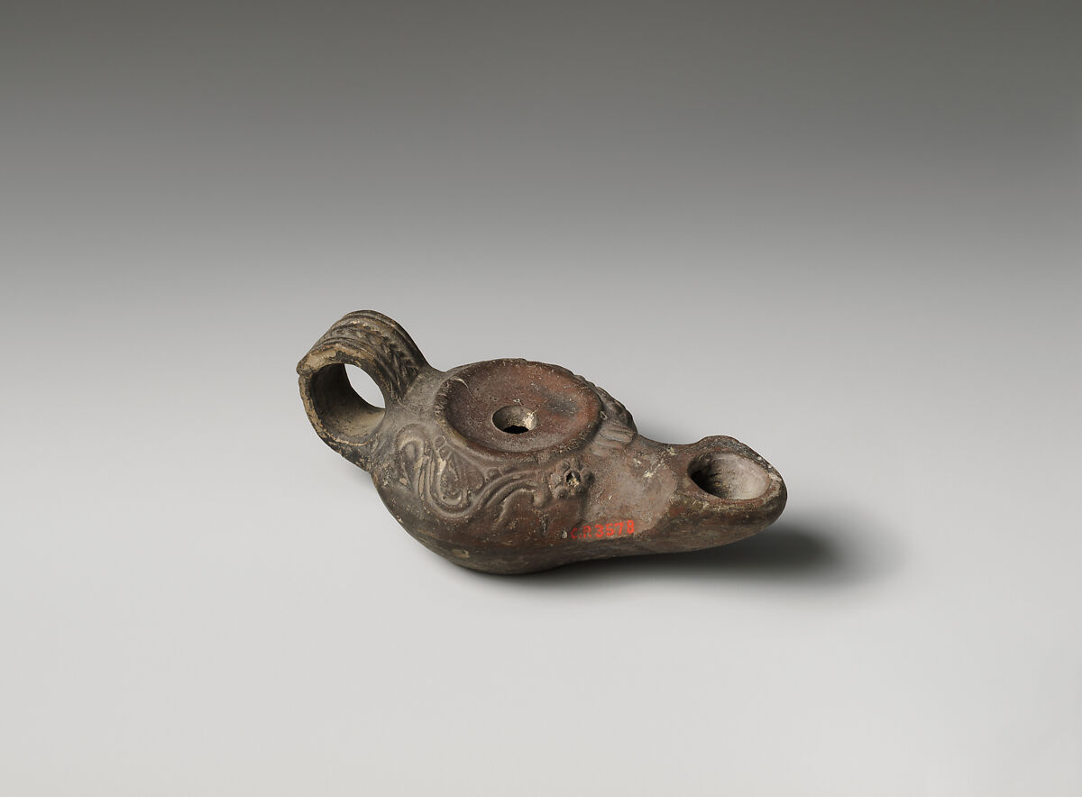 Mold-made, with ring handle. Plain, concave discus, with central filling hole and raised edge. On the convex-curving shoulder, a vine tendril with three large leaves and ending in a small bunch of grapes at front; a small frond decorates the base of the nozzle, which has pointed sides around the large wick hole; on handle, a broad, central cable pattern flanked by two parallel raised lines, with a cross bar at back; squat, carinated body. Raised, broad base ring, and flat base, decorated with a five-petalled rosette.