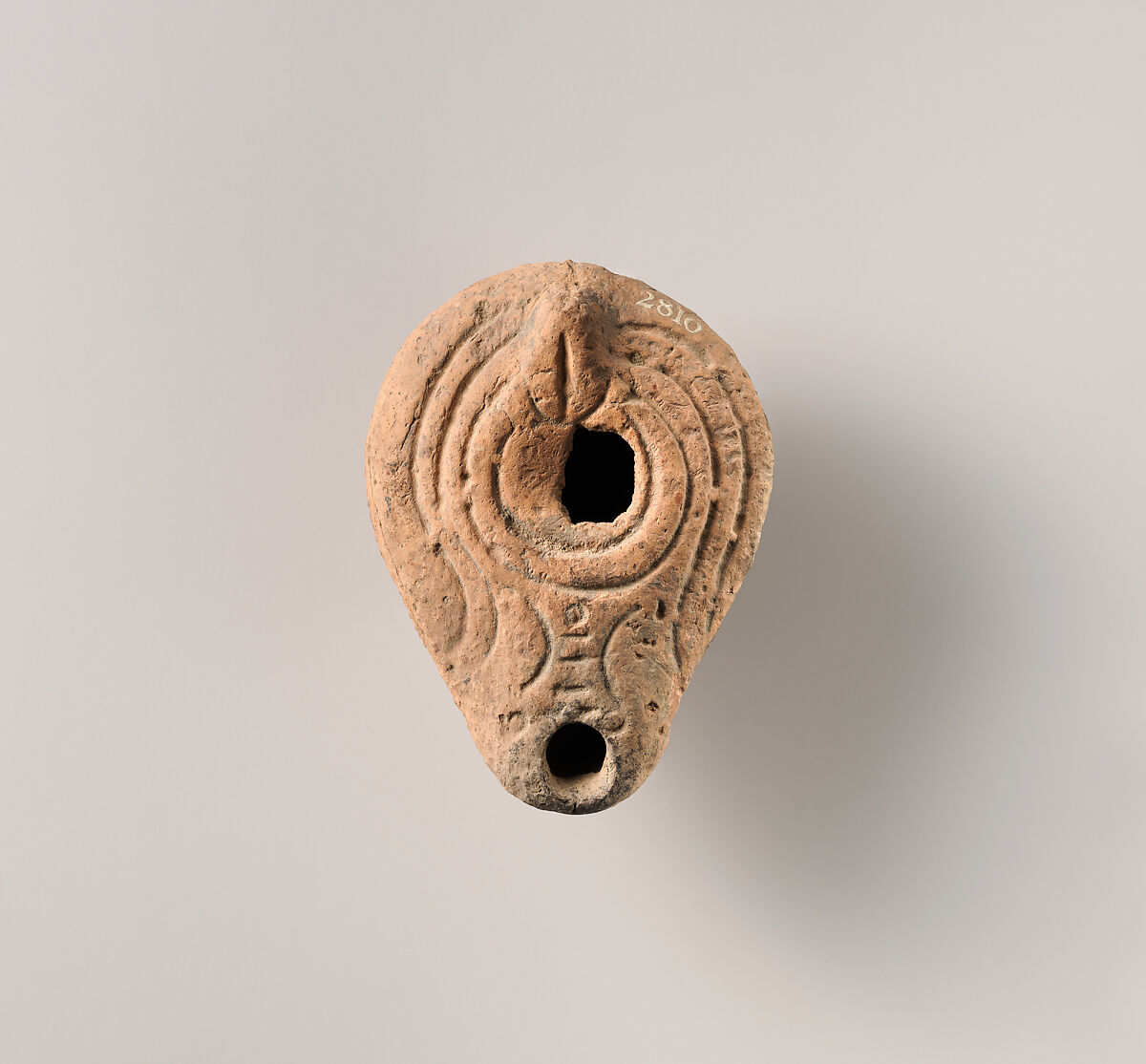 Vessberg Type 19. Mold-made, with applied conical handle. Sharply carinated body; central filling hole, surrounded by a raised circle; on shoulder, pattern of parallel, incised grooves around sides and back, and a pattern of impressed dots and short lines behind wick hole with raised rim; channel to wick hole. Flat base with two concentric grooves and a central dot.