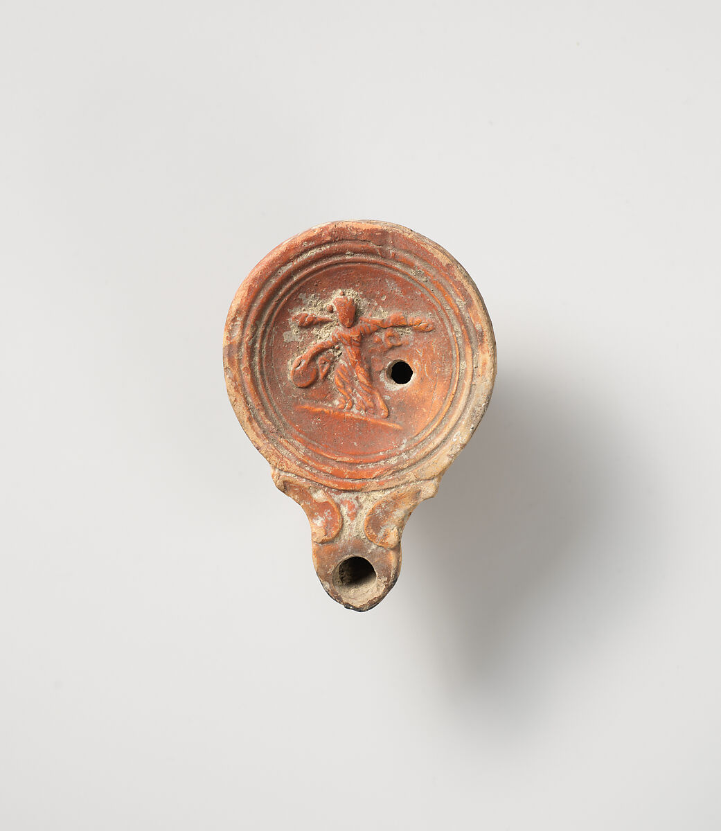 Loeschcke Type 4. Mold-made. On discus: maenad carrying large, double-ended thyrsos on shoulder and tympanum in right hand; a single filling hole to right of figure, with a band of lines and grooves towards edge. Volutes flanking nozzle. Within incised base ring, slightly uneven, pushed-in base.