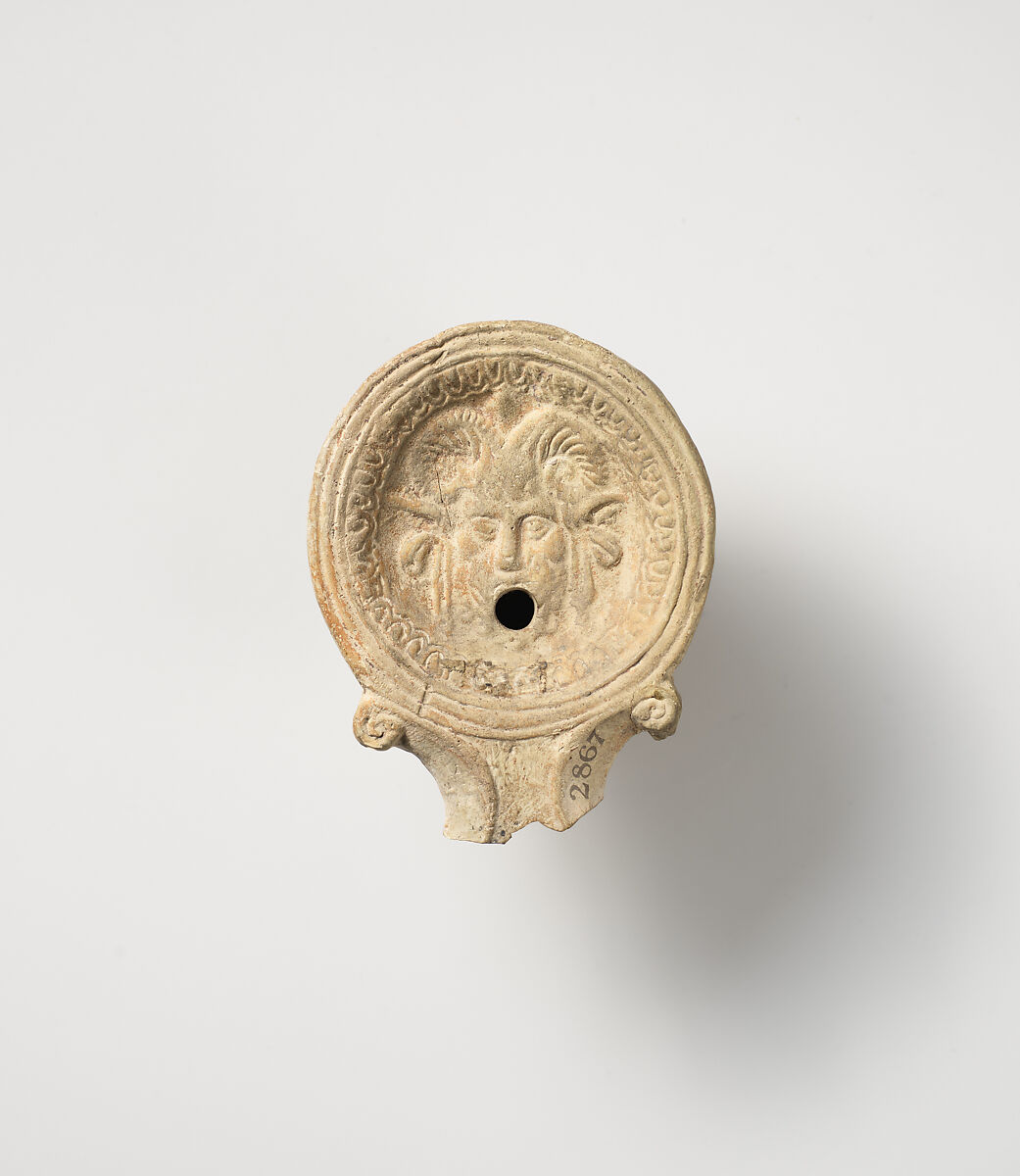 Loeschcke Type 1B. Mold-made. Large discus: mask of Pan, with large, curved horns, pointed ears, and taenia at sides of face, surrounded at edge by ovules, with a narrow band of lines and grooves at edge. Volutes flanking nozzle. Within raised base ring, uneven base, with small impressed letters across center: FAVSTI.