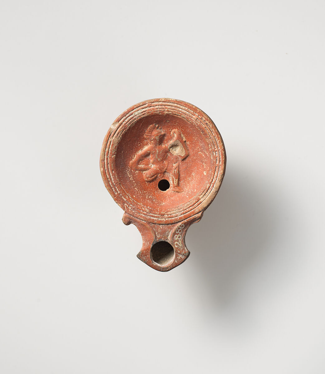 Loeschcke Type 1A. Mold-made. Discus: gladiator facing right, wearing crested helmet and greaves, holding shield up in front of him to right and short sword in outstretched right hand, and his right leg bent under him, with a band of concentric lines and grooves towards edge. Single filling hole below him towards nozzle. Volutes flanking nozzle. Within raised base ring, uneven, indented base, with the raised letter I at center.