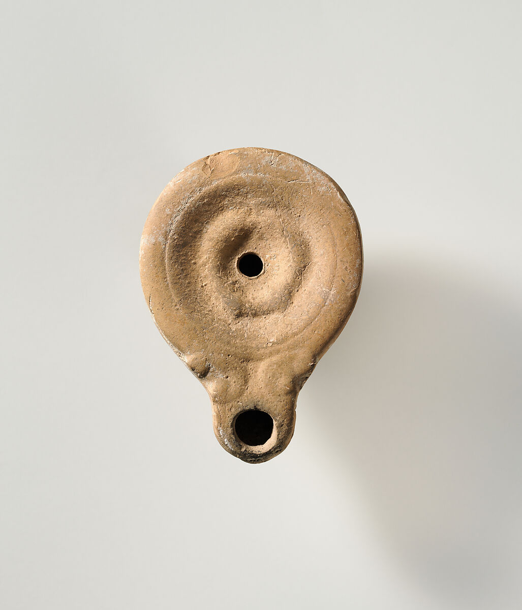 Loeschcke Type 4. Mold-made. Discus: indistinct wreath around central filling hole, with small taenia opposite nozzle. Plain shoulder. Volutes flanking nozzle. On left side of body: raised, molded letters in retrograde: ZW. Slightly raised base ring and flat base.