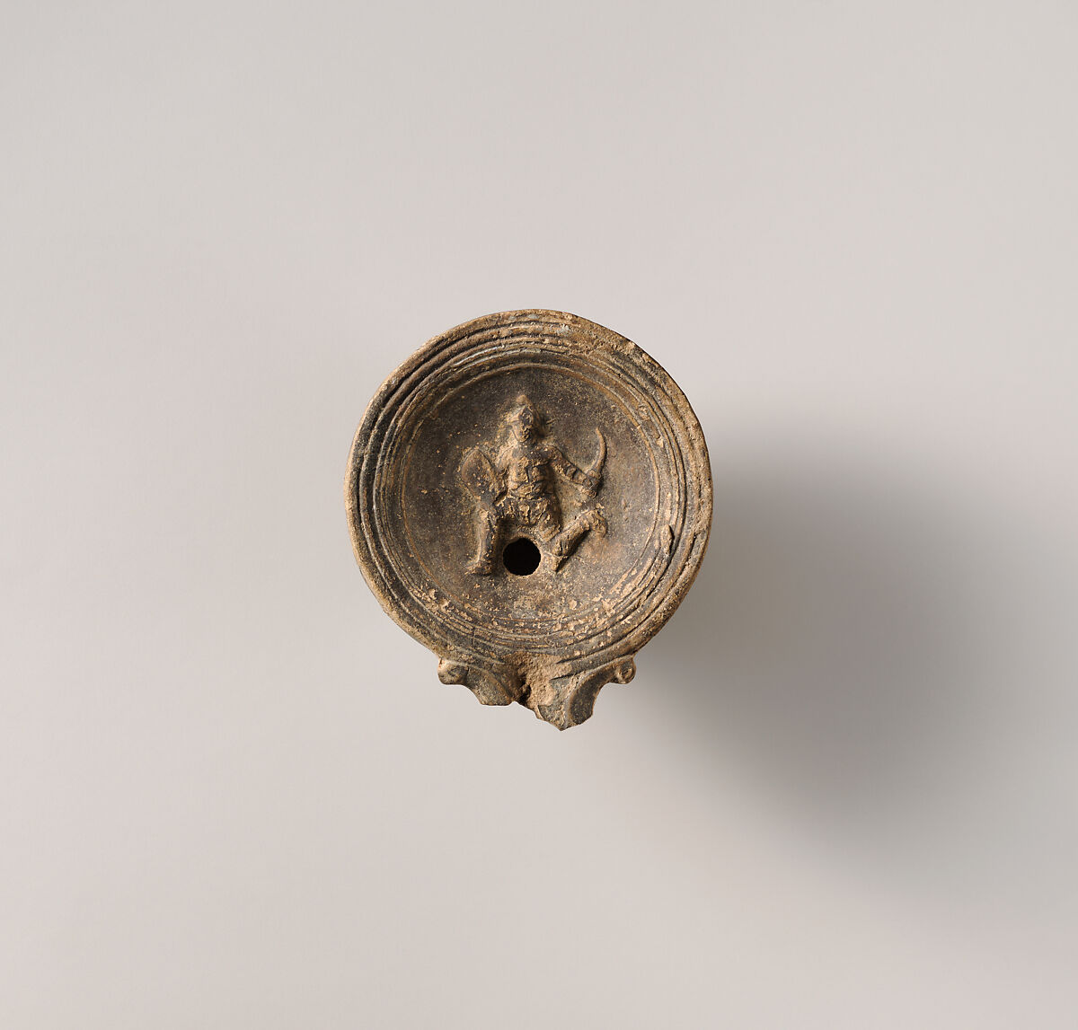 Discus: gladiator, facing left, either running or kneeling with his left leg bent up behind him, wearing a helmet, and carrying a rectangular shield in front of him in his right hand and a short, curved sword in his outstretched left hand behind him. Shoulder: continuous band of lines and grooves. Volutes flanking nozzle. Raised base ring; flatbase inscribed in small Greek letters: CΓEΛΛE.