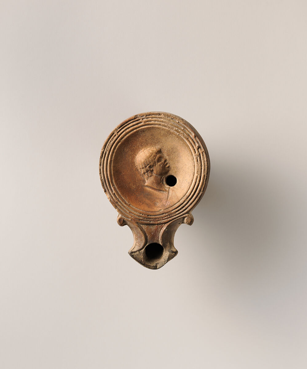 Loeschcke Type 1A. Mold-made. Discus: head of African in high relief, facing right; single filing hole to lower right. Shoulder: continuous band of four lines and grooves. Volutes flanking angular nozzle with large wick hole. Raised base ring, outlined by two grooves; uneven, concave base inscribed across center: I·A·G (?).