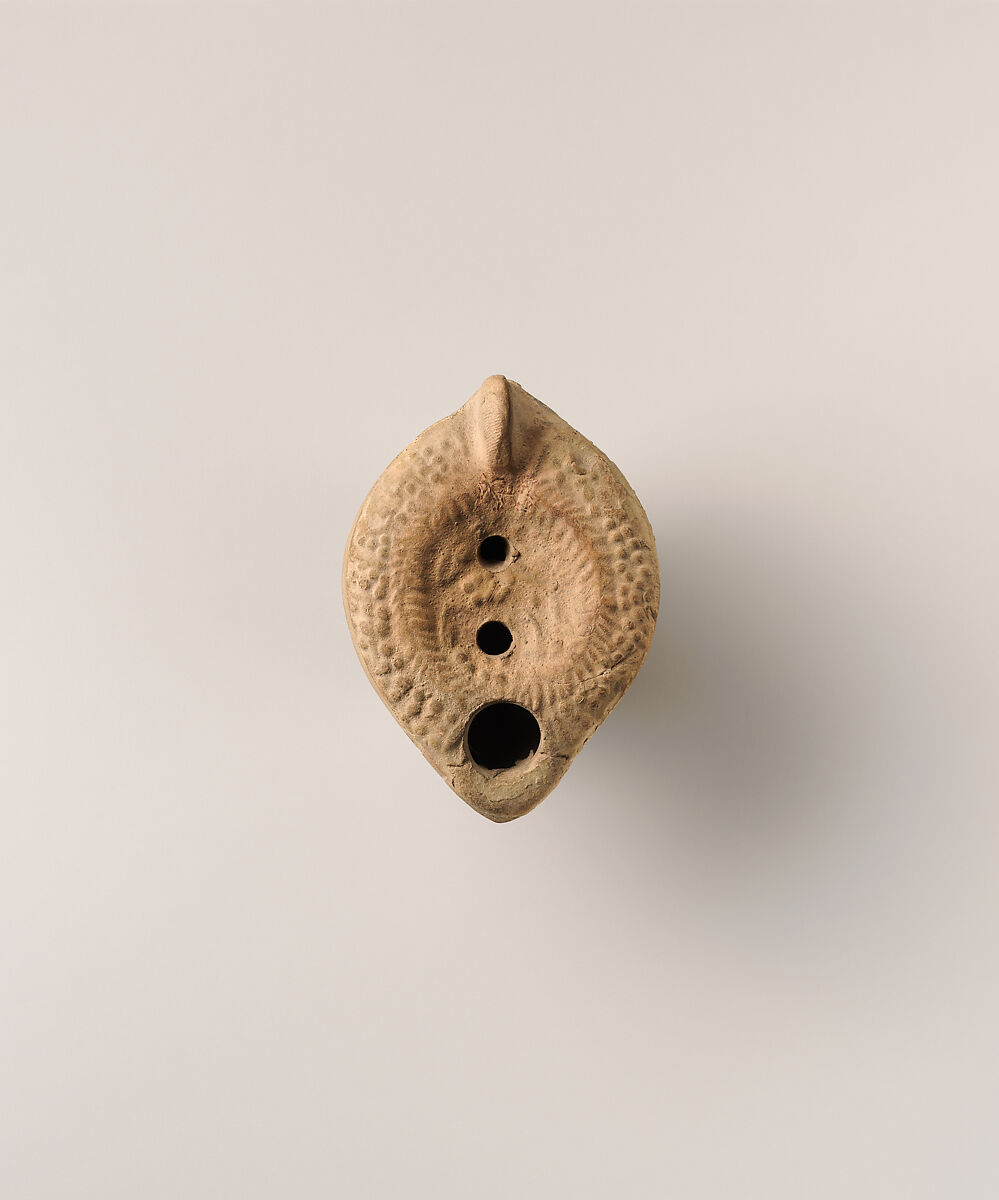 Vessberg Type 18. Unpierced handle. Mold-made. Discus: racehorse running left and wearing ornate collar, flanked to either side by herringbone wreath; two filling holes above and below horse. On shoulder, stylized vine tendril with bunches of grapes. On undefined, concave base, star design with indistinct letters (?) between rays. Buff clay.
