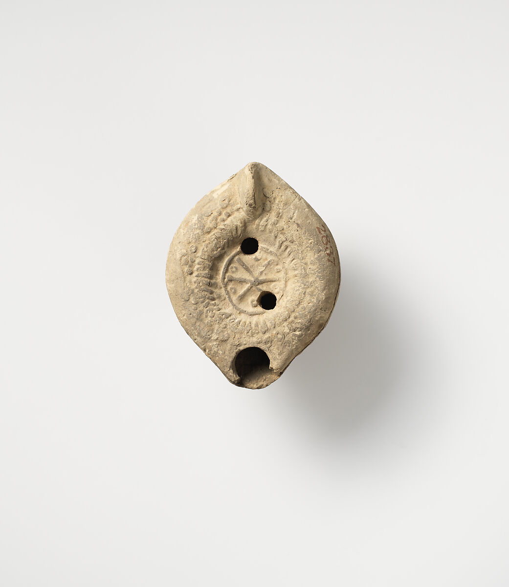 Loeschcke Type 8. Unpierced handle. Mold-made. Discus: within a raised circle surrounding a Chi-Rho (?) with hollow circles between arms; two filling holes at top and bottom across raised circle. Shoulder: a herring-bone wreath around edge of discus, and vine scroll towards edge. Large wick hole.