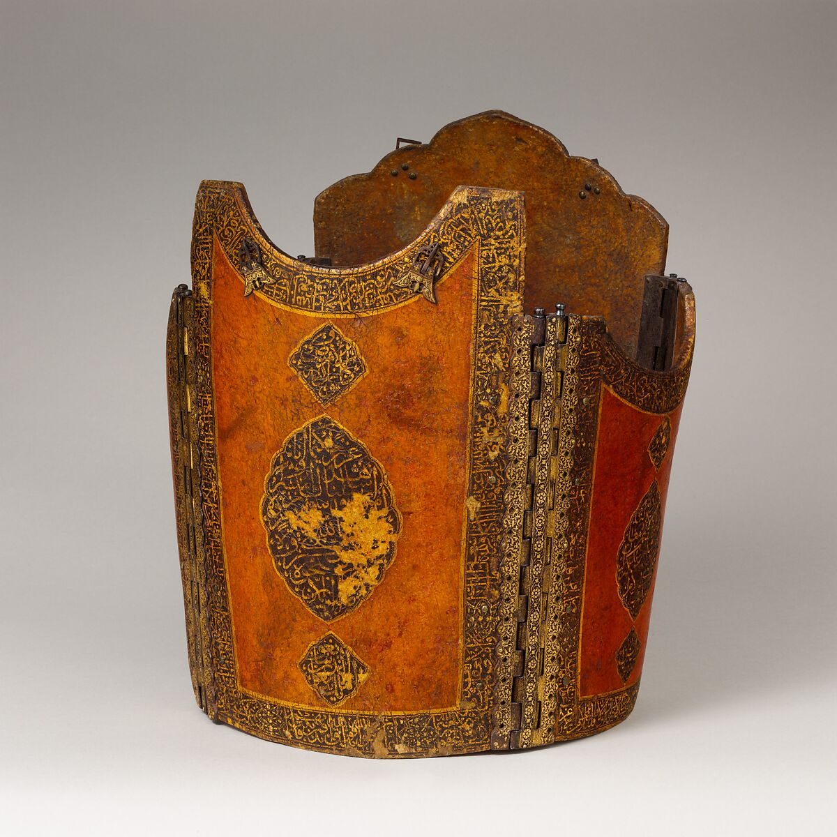 Another section of the Qur'an often employed in military contexts is the sūra of Victory (sūrat al-fatḥ, 48:1–29). Several of its verses fill the central cartouches and wide borders of this Indo-Persian armor for the torso, known as a chār-āina. Chār-āina in Persian is literally "four mirrors," a term applied to armor of this type because it is usually fashioned of four circular or rectangular steel plates reminiscent of early mirrors of polished metal. This example, however, is made of four hinged panels of hardened leather, probably buffalo hide, painted red, gold, and black. Although buffalo-hide shields were made in India until the nineteenth century, a chār-āina in this material is rare, if not unique.