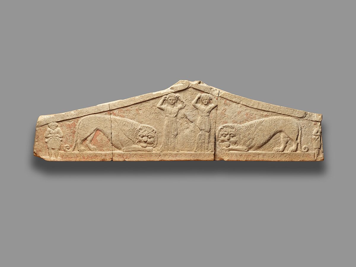 In the center two women stand tearing their hair in mourning. They are flanked by lions and diminutive figures that may represent a Master of the Animals, known in Near Eastern art, or else the Egyptian god Bes. An inscription on the lower edge reads: "I am Aristokretes, my brothers set [this] down in memory of good deeds that I once did well."
