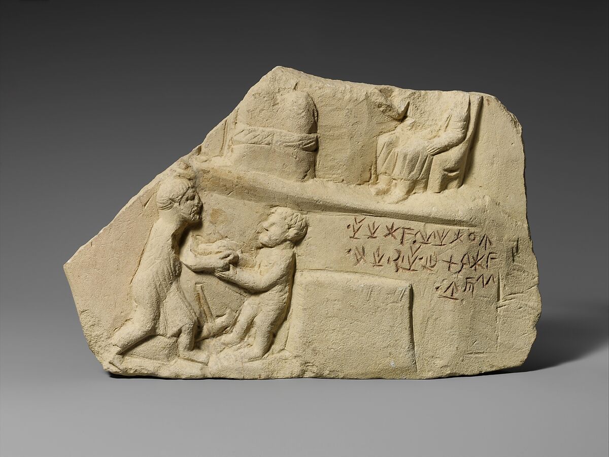 Above is a figure, identified as Apollo, seated before an altar or baetyl (sacred stone), and below is a scene interpreted as showing workers in a mine or quarry. The inscription, in Cyprio-syllabic script, reads, "Diaithemis dedicated [this] to the god Apollo in good fortune." Such inscriptions show that in the Hellenistic period, while Greek became the dominant language used in Cyprus, the local script continued to play a part, especially in religious rites and for dedications to the gods.