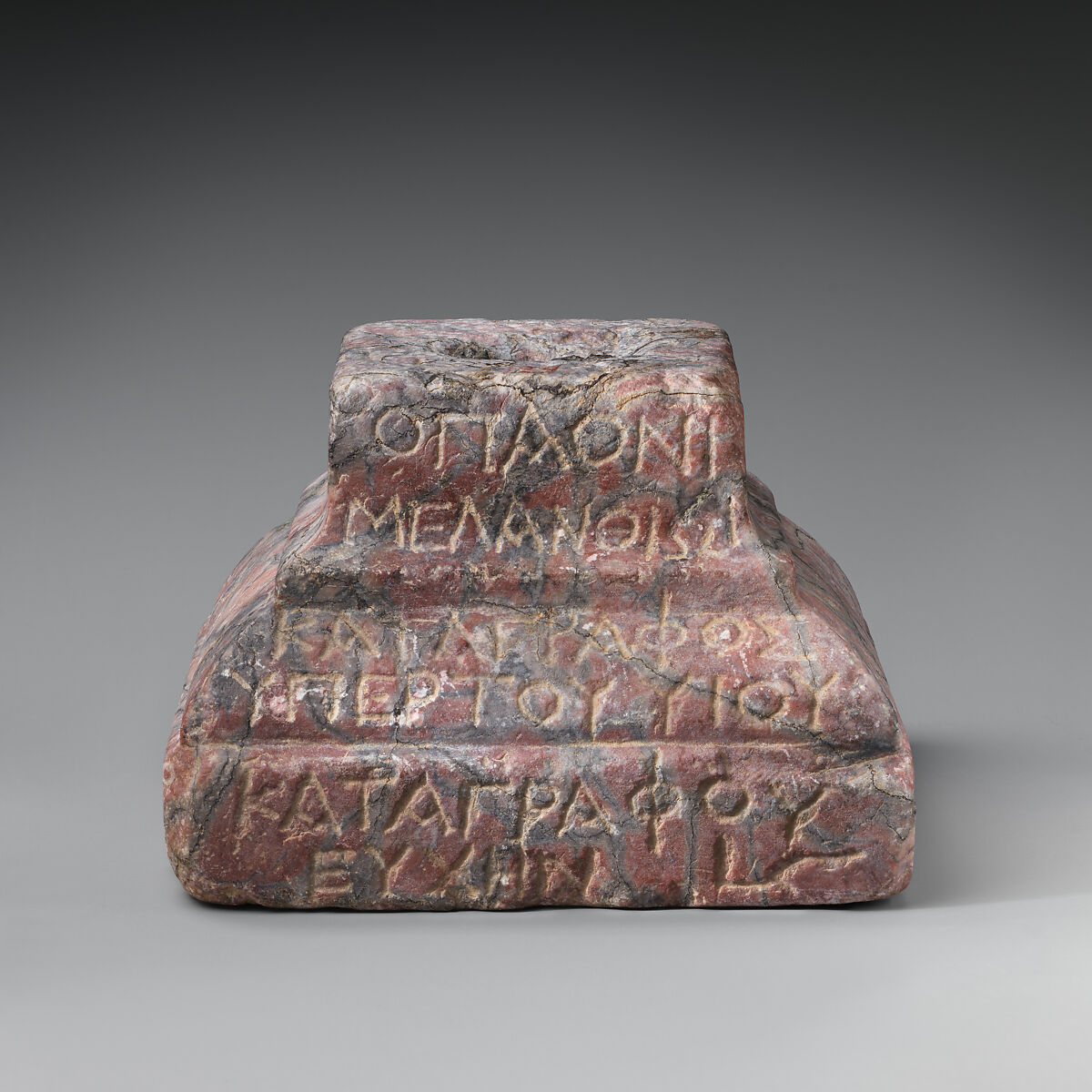 The base may have held a small statue. The Greek inscription records a dedication by a man called Katagraphos on behalf of his son to the cult of Opaon Melanthios located at Amargetti, near Paphos.