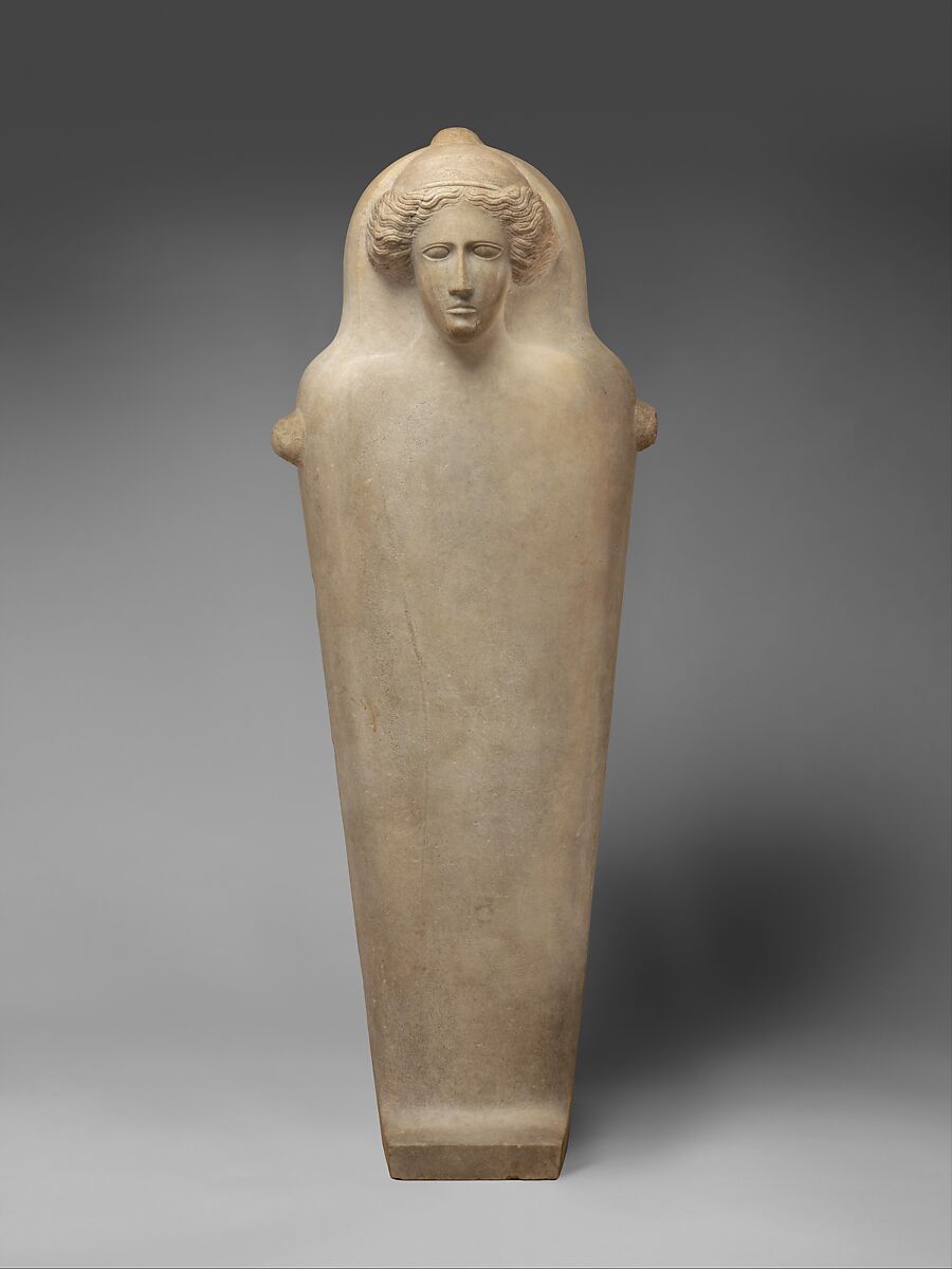 The lid of the sarcophagus shows an unarticulated, downward tapering body and the head of a woman framed by flowing hair; traces of red paint are still preserved in the hair. At the foot end of the box and on the lid appears the Phoenician letter "shin." According to recent investigations, the anthropoid sarcophagi of marble were quarried on the Greek island of Paros. They were prepared up to a certain point and finished at their destinations. The inscribed letters here strongly suggest that the sculptor was Phoenician, which would be entirely plausible at Amathus and Kition, two centers of Phoenician occupation on Cyprus. Such fine, expensive coffins inspired local copies in limestone and terracotta.