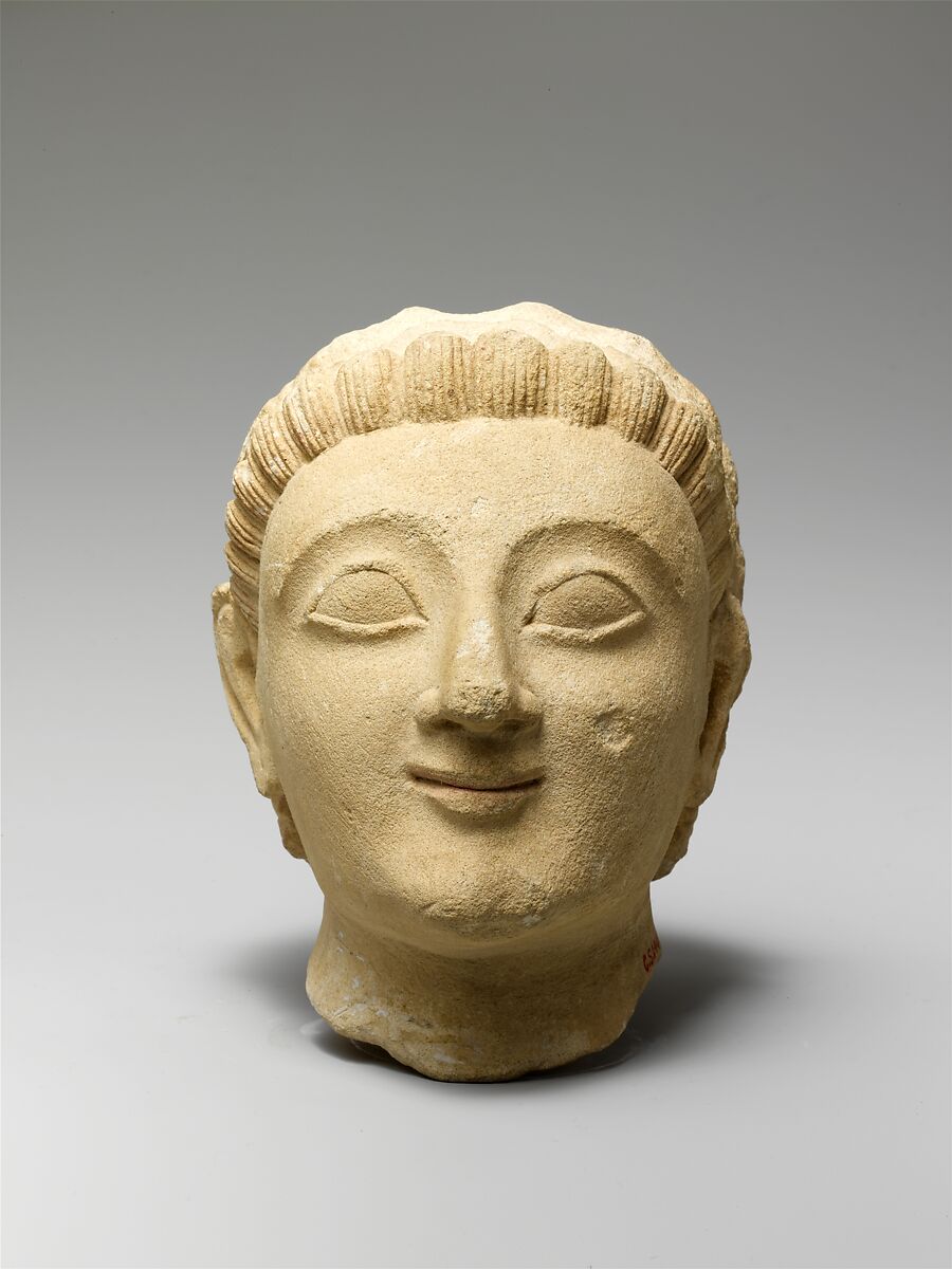 The facial features are delicate. The lips, with traces of red paint, show a smile. The nose is slightly hooked, the eyes wide open. The line formed by the eyebrows is long and thin. The ears are carefully articulated. A row of locks rises above the forehead. On the head, the hair is divided into large transversal locks that form a kind of arch on the back. The details are indicated by small triangles.