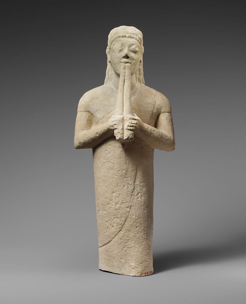 he figure wears a chiton and a himation, draped over the left shoulder, and holds in each hand the reed of a large aulos, the lower end of which is attached to the abdomen.