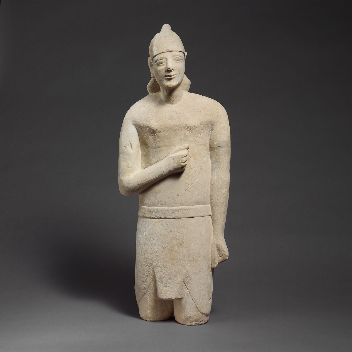 - Title:Limestone statuette of a beardless male votary in Egyptianizing dress wearing a helmet