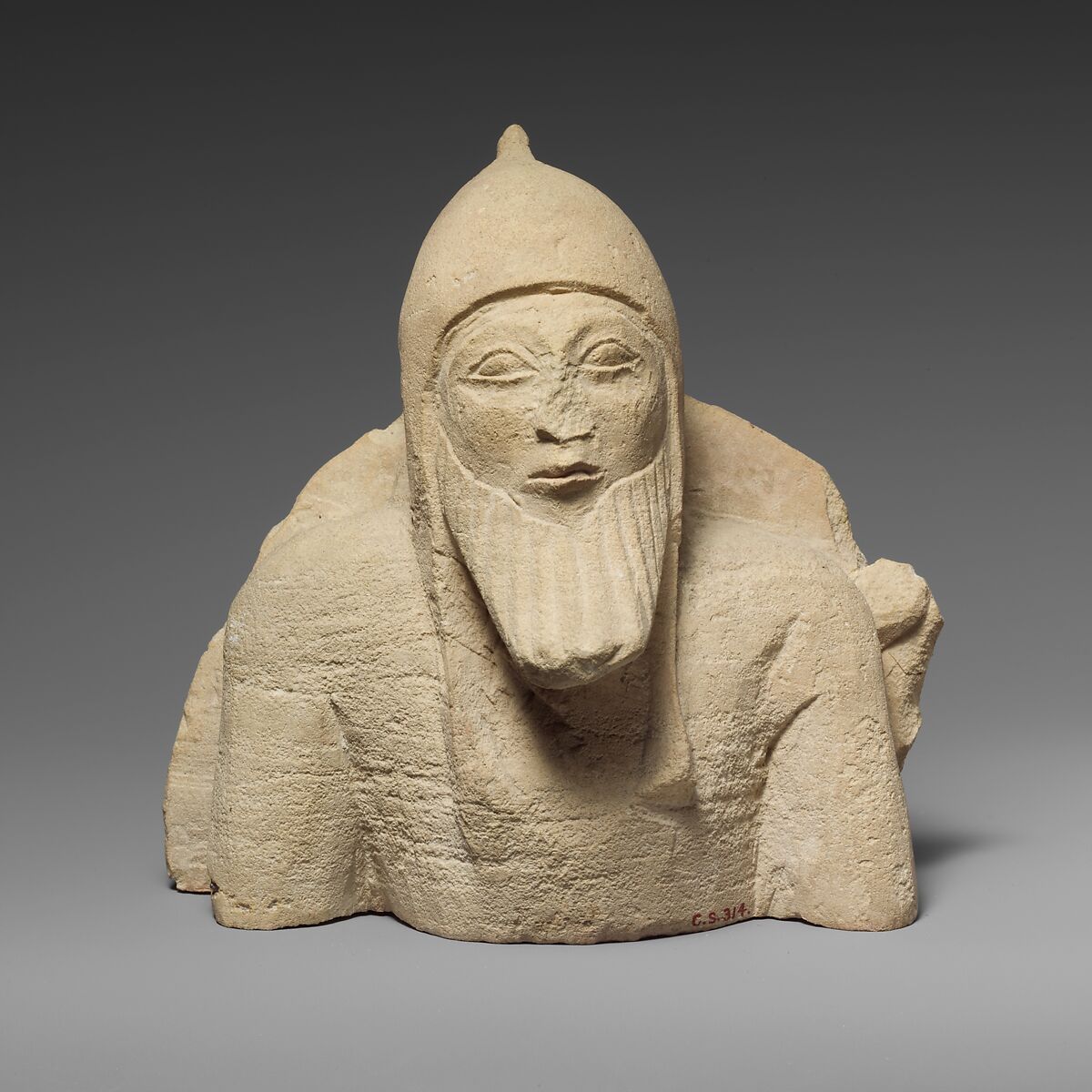- Title:Upper part of a limestone warrior from a chariot group