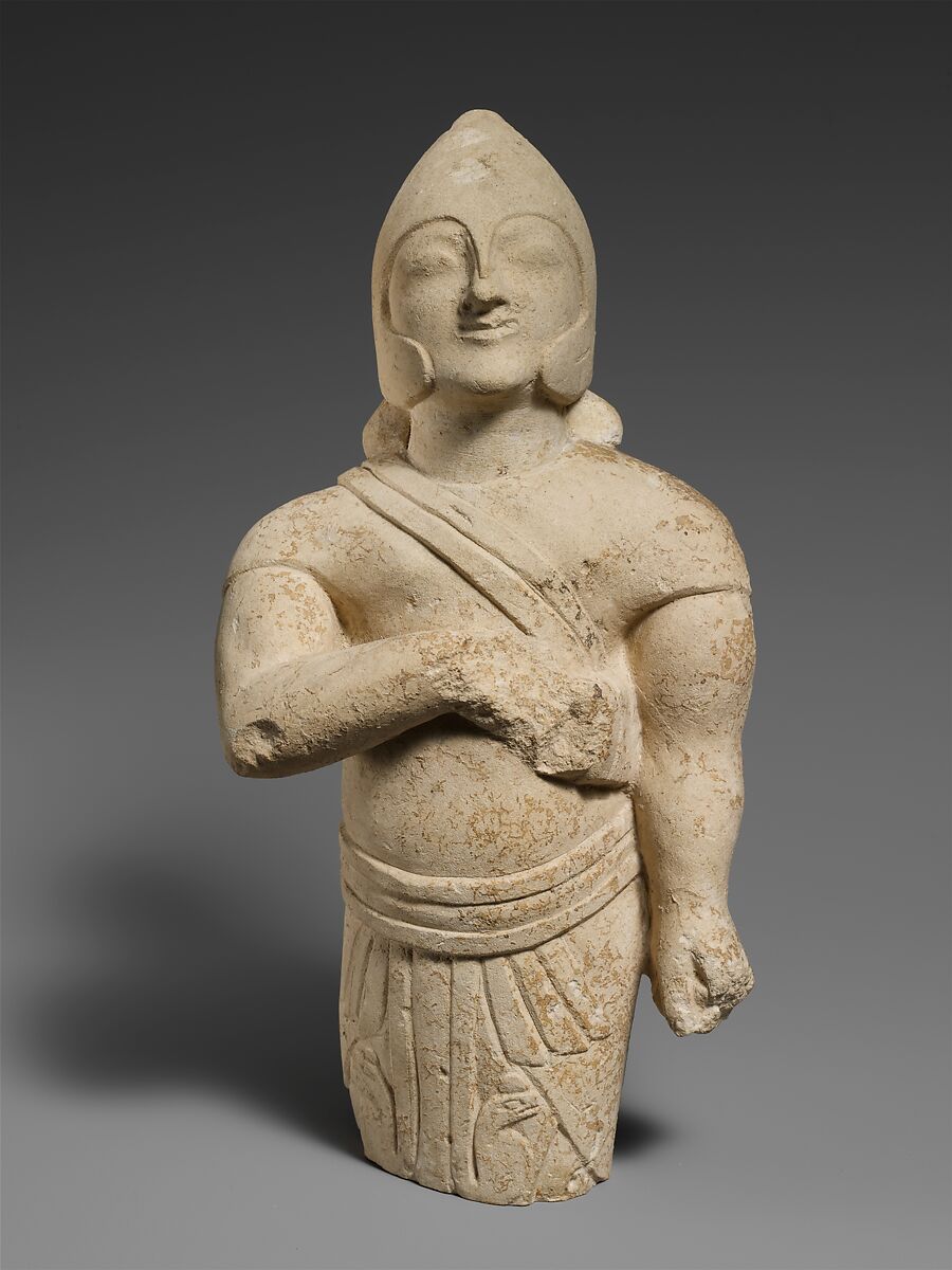 Egyptian and Greek features are melded in this figure. He wears the Egyptian kilt with a modified Greek helmet; the soft rounded forms that hug the head leave unclear whether the helmet is made of metal. The articulation of musculature, particularly in the arms, is a further indication of Greek influence.
