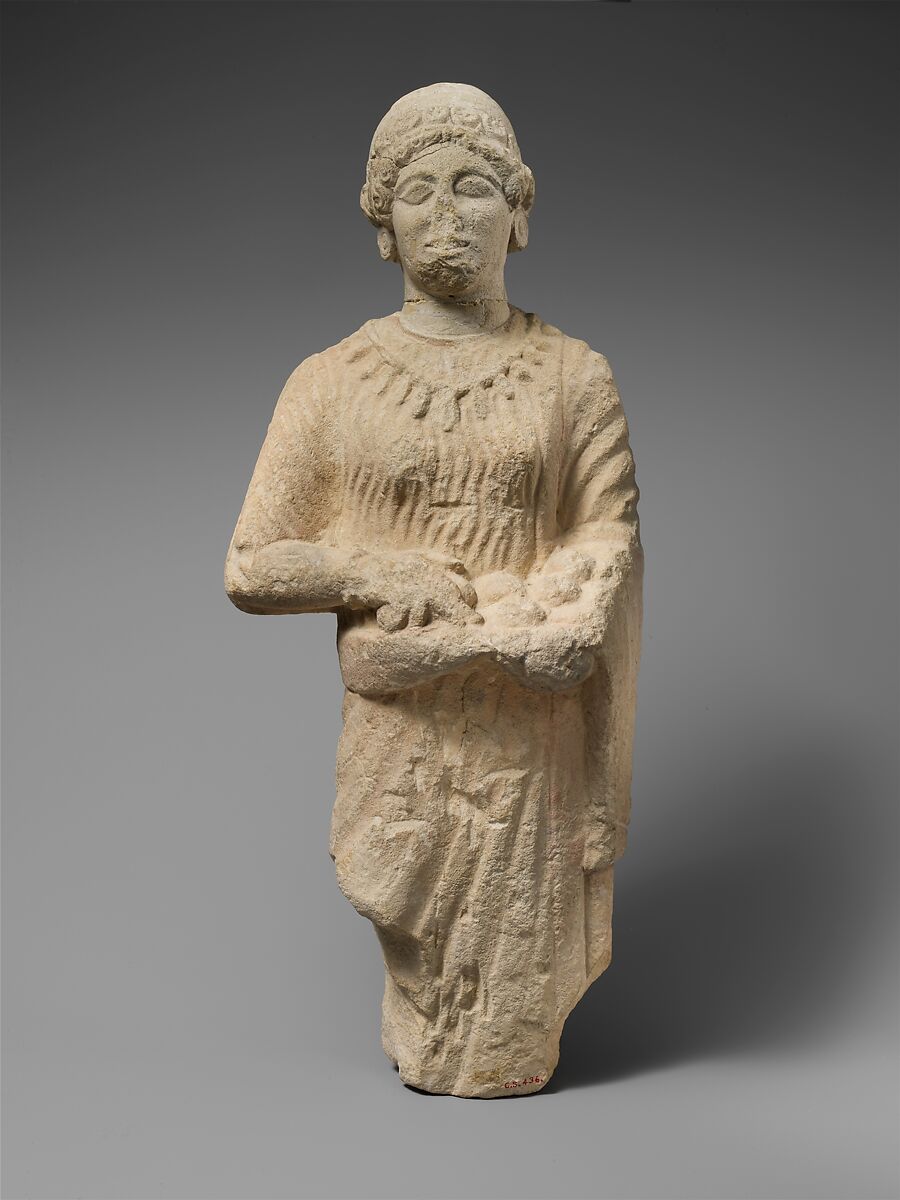 - Title: Limestone statuette of a female votary holding pieces of fruit