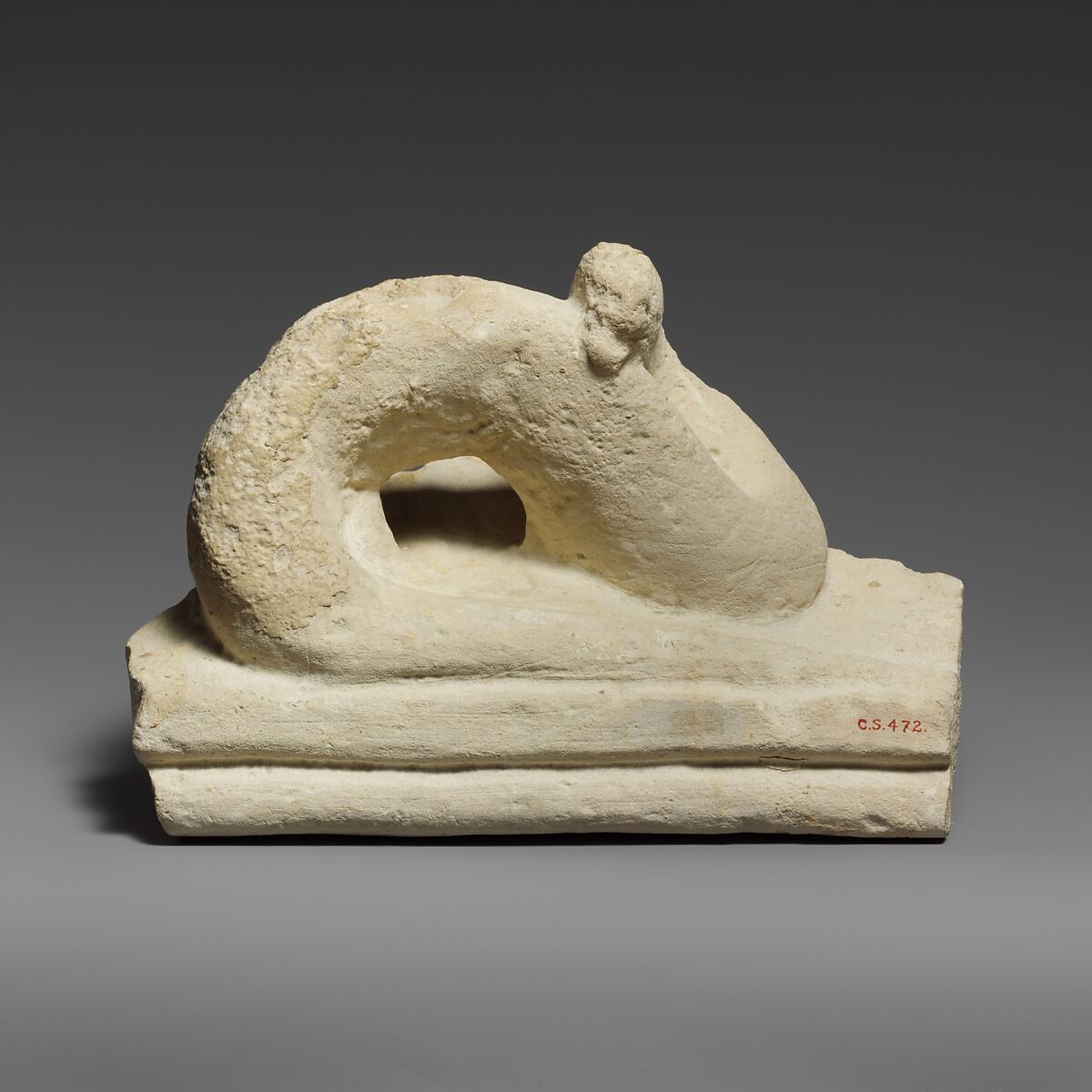 - Title:Two fragments of a limestone sarcophagus lid with snakes