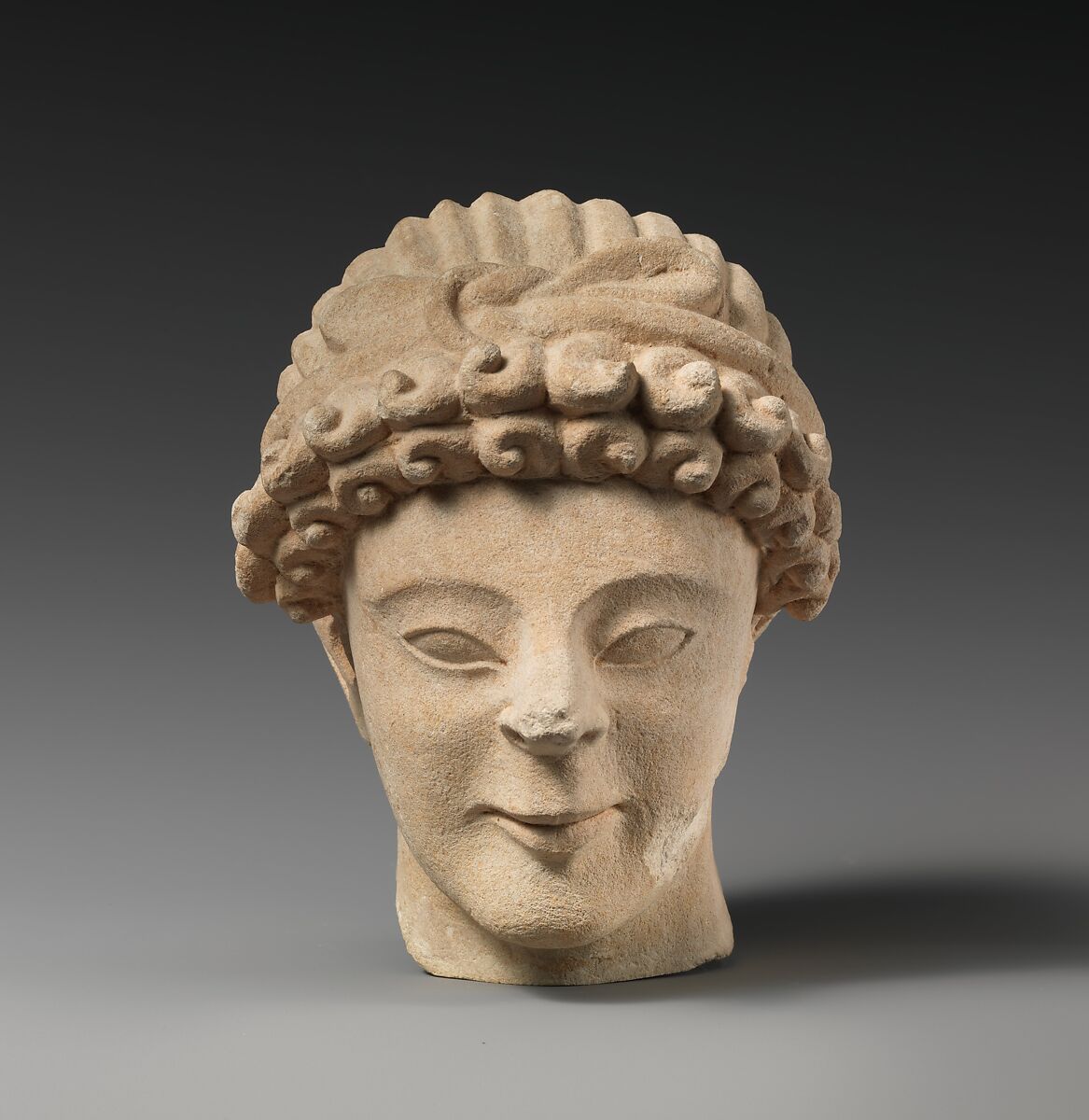 - Title: Limestone head of male votary with fillet