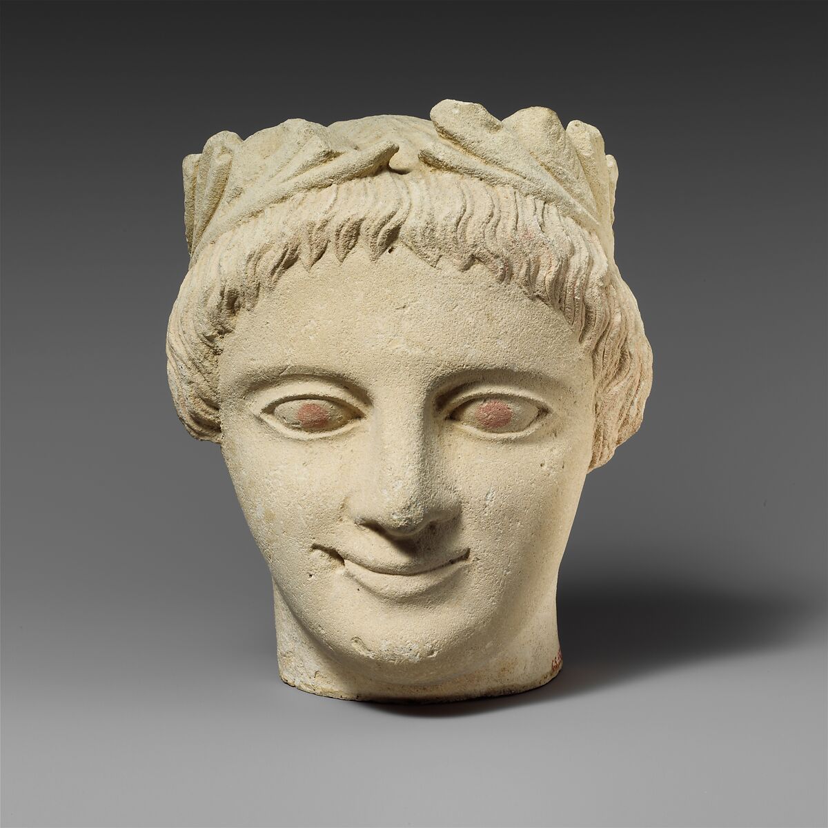 - Title:Limestone head of a beardless male votary with a wreath of leaves