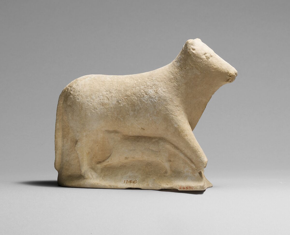 The cow is of a piece with the base, from which the suckling calf emerges in relief. This votive statue is similiar in style and subject to 74.51.2595.